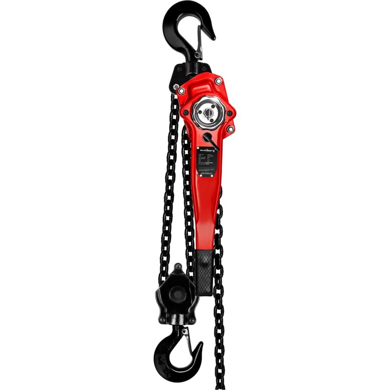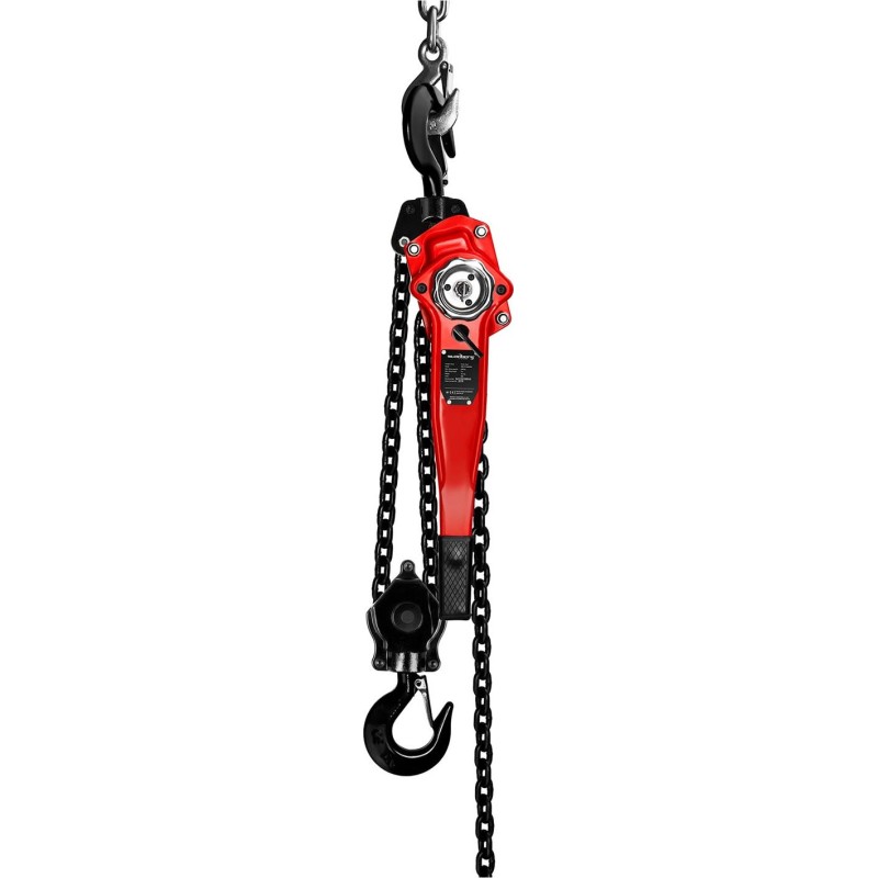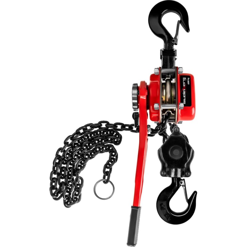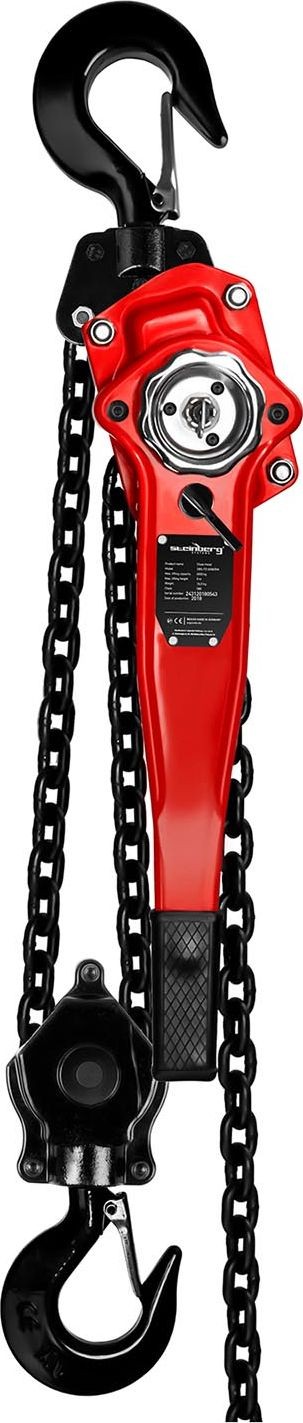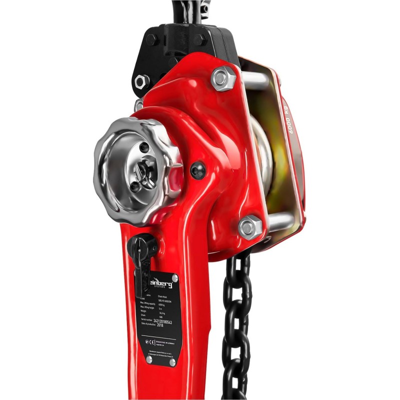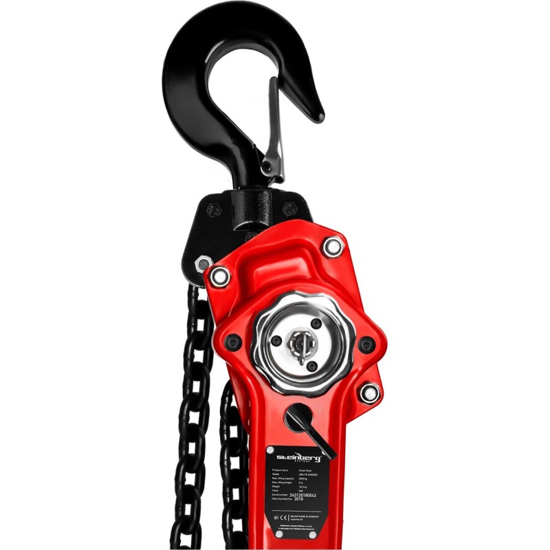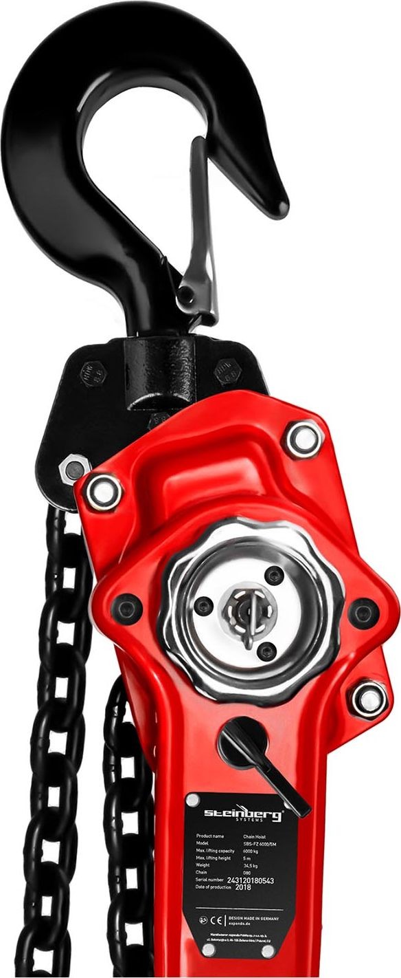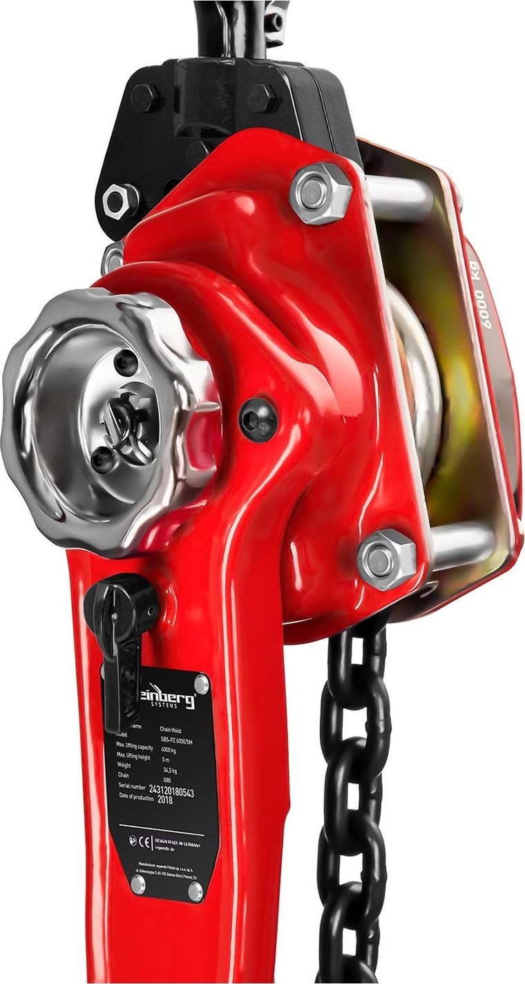 Mit dem manuellen Kettenzug lassen sich Gegenstände mit einem Gewicht von bis zu 6000 kg auf eine Höhe von bis zu fünf Metern heben. Dank der robusten Ketten (Typ G80, Glieder mit 10 mm Durchmesser) und der Fertigung der Bauteile aus hochwertigem Stahl ist die Arbeit mit dem Modell SBS-FZ 6000/5M sehr sicher. Dazu tragen auch die gummierte Spitze der Steuerwelle und die Arretierung bei, mit der die Last auf der gewünschten Höhe gehalten werden kann.