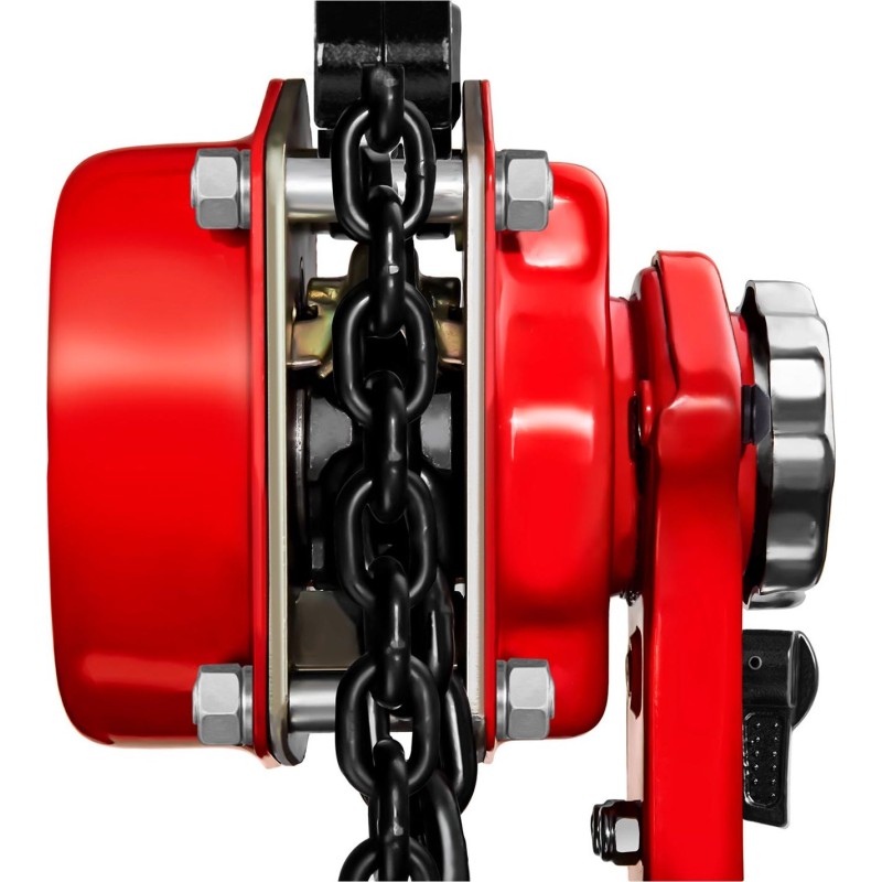Um den Bedienkomfort zu erhöhen, ist der Hebezug mit zwei drehbaren Haken sowie einem Hebel mit leichtgängiger Übersetzung ausgestattet, der mit einem Mechanismus im Inneren des Gehäuses verbunden ist. Dies ermöglicht ein komfortables Heben und Senken des Lastguts.