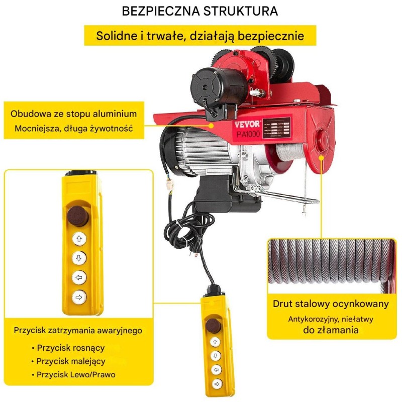 Die Sicherheit bei der Nutzung ist von entscheidender Bedeutung, daher besteht die Winde aus einem Gehäuse aus Aluminiumlegierung und einem verzinkten Stahlseil, was Korrosionsbeständigkeit und eine lange Lebensdauer gewährleistet. Darüber hinaus verhindern ein Endschalter und ein Haken aus Manganstahl ein plötzliches Herabfallen der Last, was die Sicherheit bei der Arbeit erhöht.