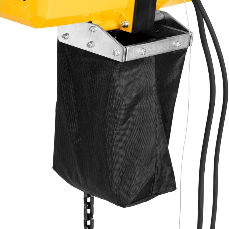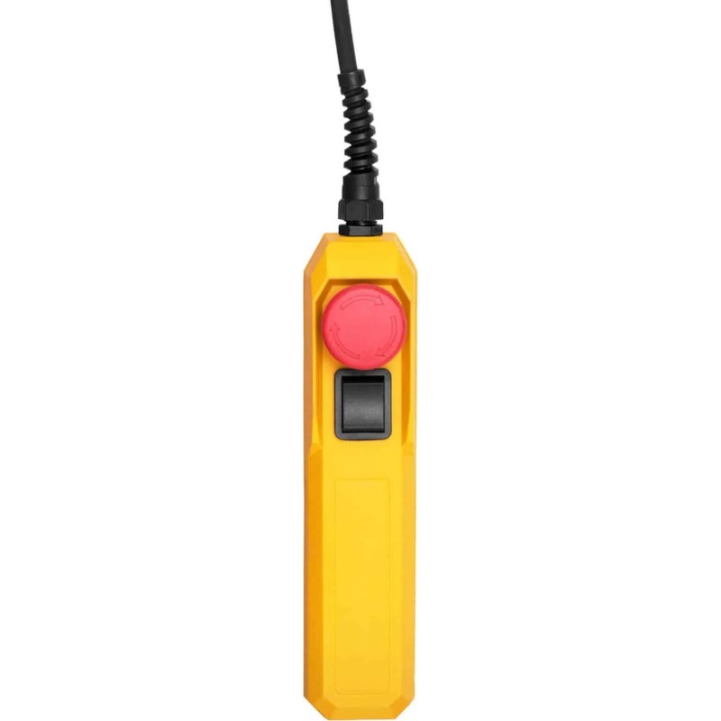 ist über ein langes Kabel mit dem Gerät verbunden, sodass Sie das Gerät aus sicherer Entfernung steuern können. Der Not-Aus-Schalter an der Fernbedienung stoppt das Gerät im Gefahrenfall. Der Lastbügel ist mit einer Sicherheitsverriegelung ausgestattet, die einen sicheren Transport der befestigten Last gewährleistet. Die Edelstahlkette mit einem Durchmesser von 6,3 mm ist robust und verschleißfest. Das Stahlgehäuse ist kratz-, splitter- und korrosionsbeständig. Der Hebezug verfügt über die Schutzart IP54 und ist gegen das Eindringen von Schmutz oder Wasser geschützt. Er verfügt außerdem über einen Überlastschutz.