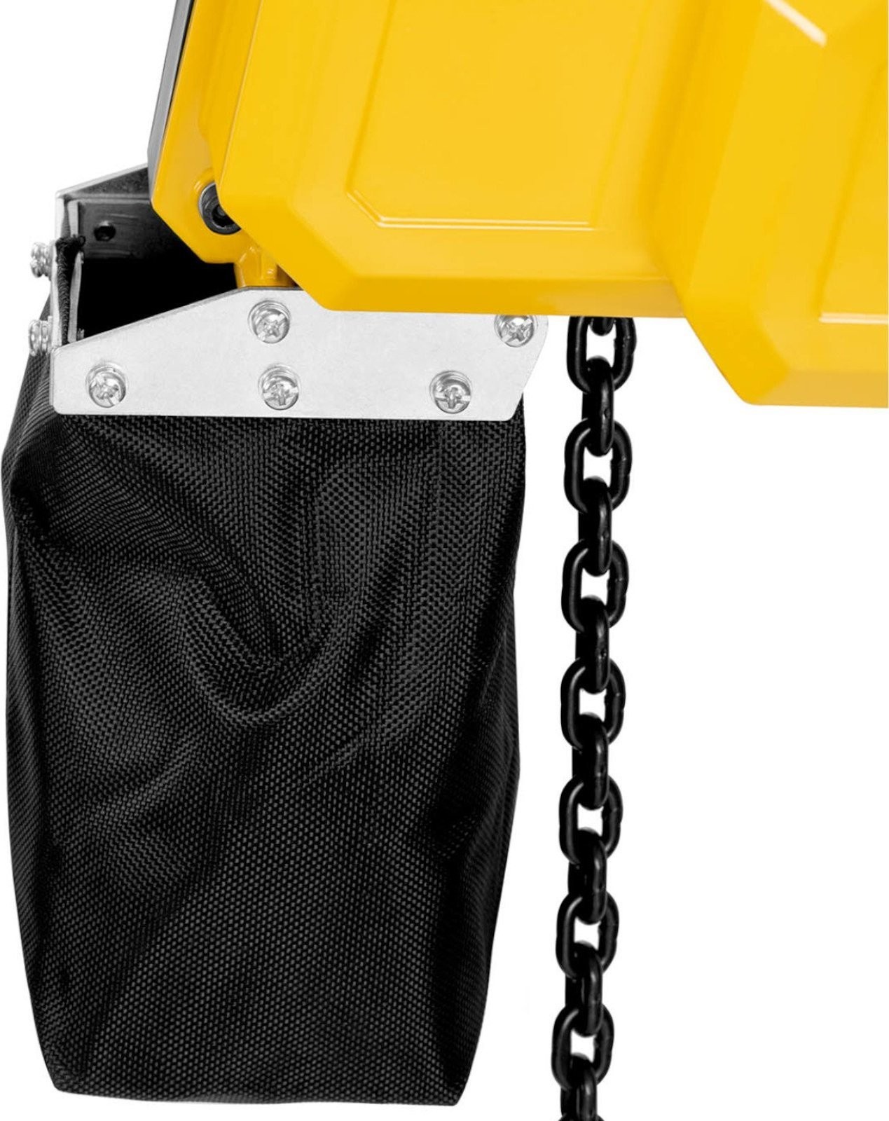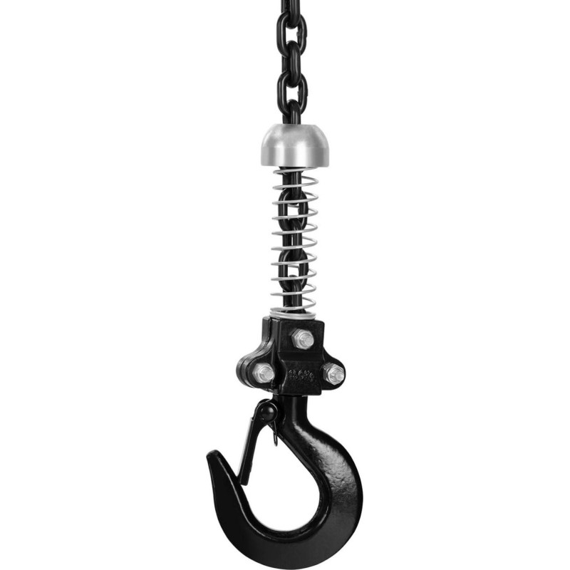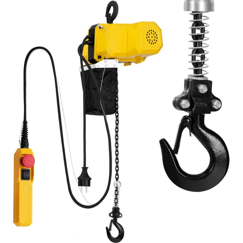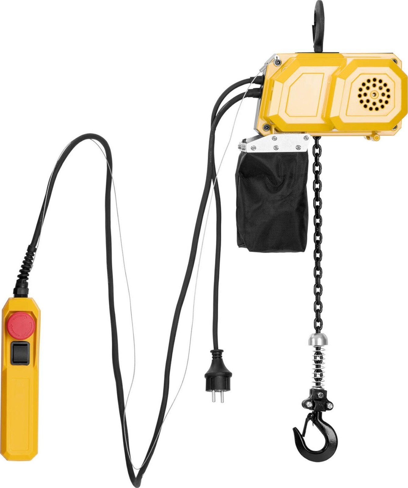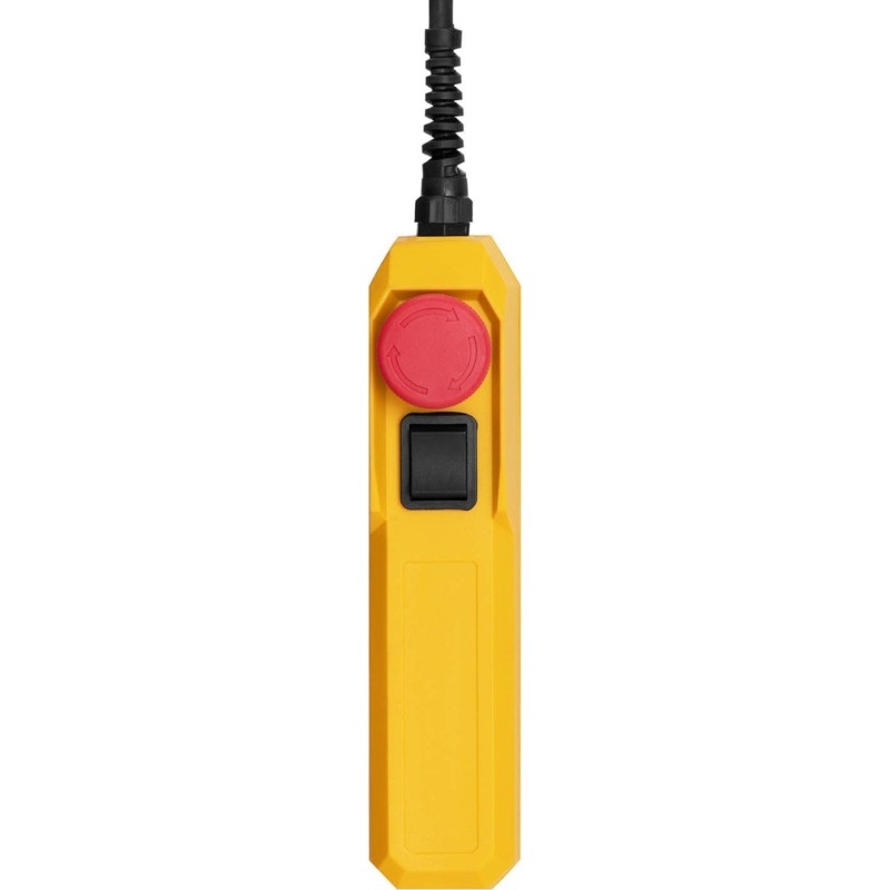 . Mit der kabelgebundenen Fernbedienung lässt sich das Gerät aus der Ferne steuern. Ein Not-Aus-Schalter stoppt die Kette. Der Lastbügel verfügt über eine Sicherheitsverriegelung
