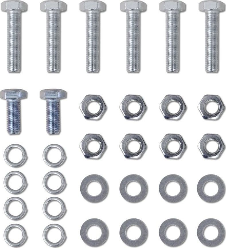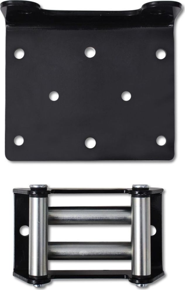 Der Lieferumfang umfasst: 1 x Winde, 1 x Montageplatte, 1 x Seilführungsrolle, 1 x Haken mit Seil, Netzkabel sowie Montagezubehör wie Schrauben und Muttern.