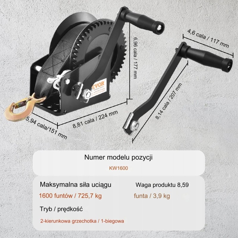 Dein neuer Begleiter für schwere Arbeiten – unsere Handwinde. Mit einer Tragkraft von 725 kg, einem 10 m langen Gurt, einem bidirektionalen Ratschenmechanismus mit einer Übersetzung von 4:1 und einem 20 cm langen Griff ist sie bereit, dein professionelles Zugwerkzeug für unterwegs zu sein.