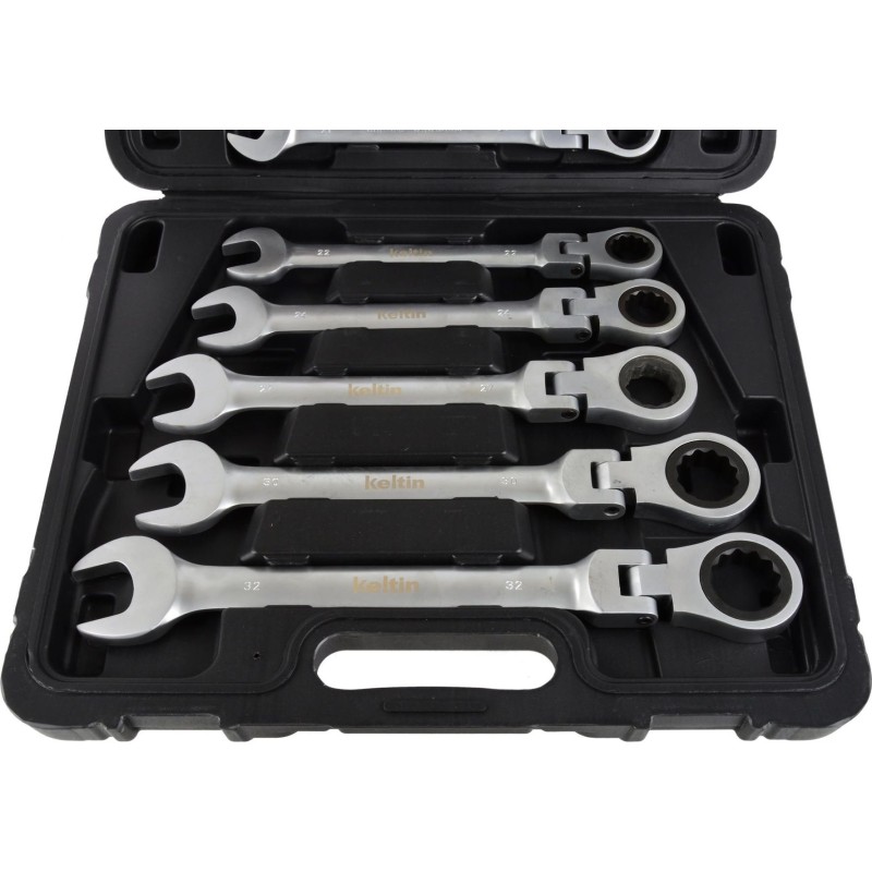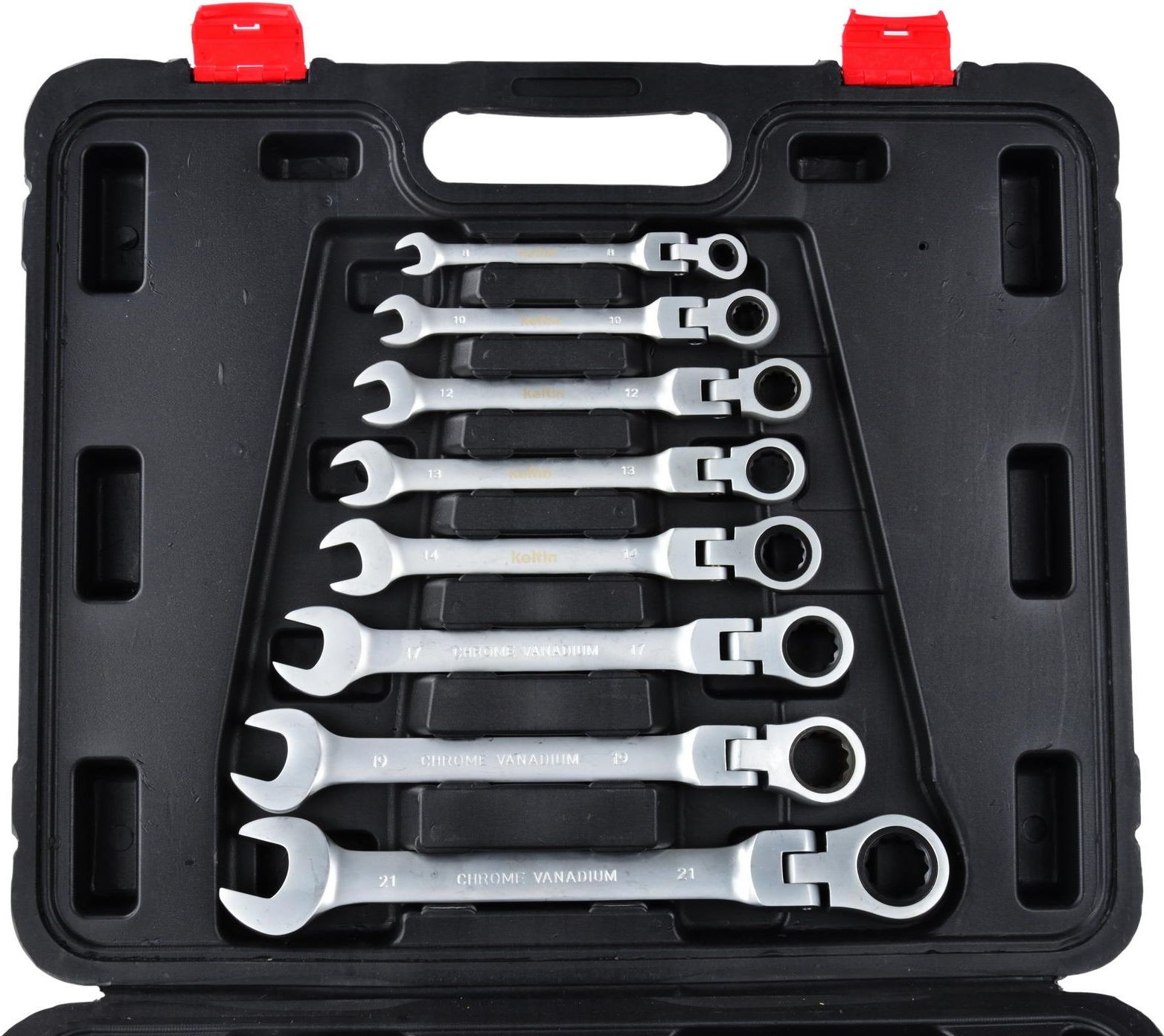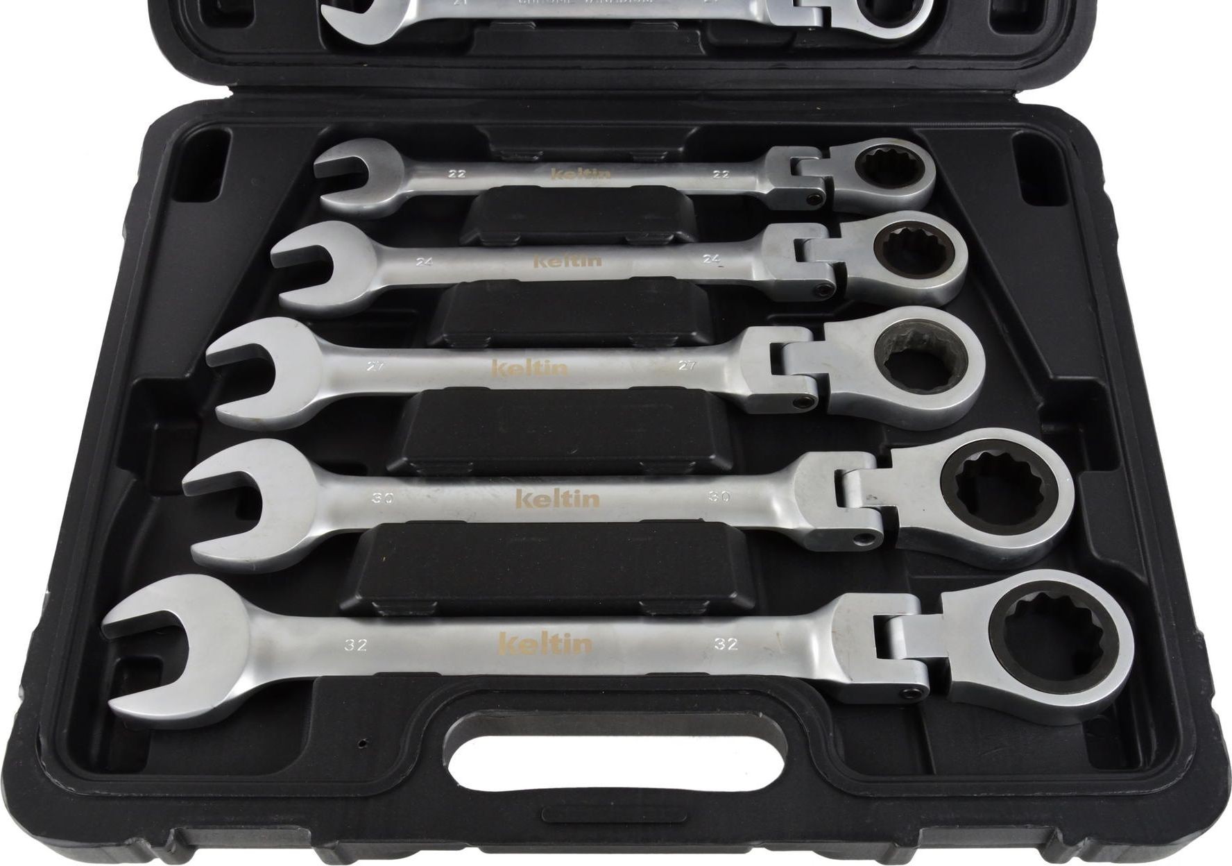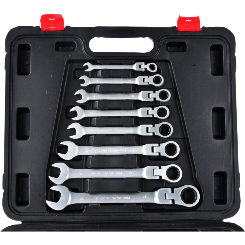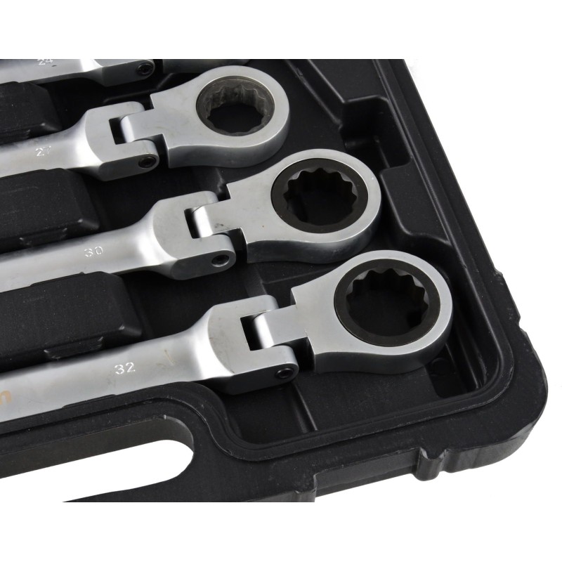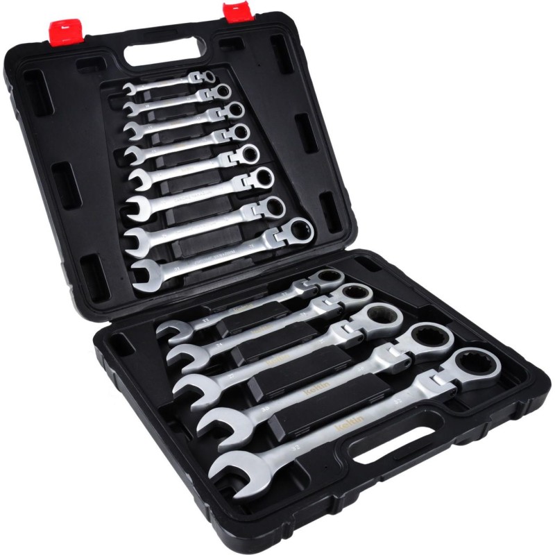 Satz aus flach-ringförmigen Klappschlüsseln mit Ratsche (72 Zähne) 8–32 mm aus robustem Chrom-Vanadium-Stahl (CrV). Sie eignen sich sowohl für professionelle Kfz-Werkstätten als auch für die heimische Garage. Die Schraubenschlüssel befinden sich in einem praktischen Kunststoffkoffer. Produktmerkmale: robuster Ratschenmechanismus (72 Zähne) aus gehärtetem Stahl; gefertigt aus Chrom-Vanadium-Stahl (CrV) mit satinierter Oberfläche; jede Ratsche des Flach-Ring-Schraubenschlüssels ist mit einer Surface-Drive-Spitze ausgestattet, die das Lösen von Schrauben mit beschädigtem Kopf ermöglicht. Die Schlüssel befinden sich in einem praktischen Kunststoffkoffer. Da die Schlüssel leicht gebogen werden können, lassen sie sich an schwer zugänglichen Stellen einsetzen. Technische Daten Material: satinierter Chrom-Vanadium-Stahl (CrV) Anzahl der Teile: 13 Schlüsselgrößen [mm]: 8, 10, 12, 13, 14, 17, 19, 21, 22, 24, 27, 30, 32