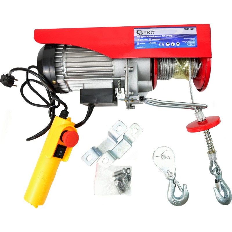 Professionelle elektrische Seilwinde mit einer Leistung von 1300 W und einer Tragkraft von bis zu 800 kg. Die Winde ist ein professionelles Gerät zum Heben schwerer Gegenstände in vertikaler Richtung. Sie wird häufig beim Hausbau und bei Renovierungsarbeiten sowie in Kfz-Werkstätten eingesetzt. Produktmerkmale Leistung: 1300 W Seillänge: 12 m Seildurchmesser: 5 mm Abmessungen der Basis: 147 x 410 mm Tragkraft an einem Haken: 400 kg Tragkraft an zwei Haken: 800 kg Hubgeschwindigkeit an einem Haken: 12 m/min Hubgeschwindigkeit an zwei Haken: 6 m/min Hubhöhe bei einem Haken: 12 m Hubhöhe bei zwei Haken: 6 m automatischer Sicherheitsschalter die Kupferwicklung des Windenmotors erhöht die Lebensdauer des Motors im Vergleich zu einer Aluminiumwicklung erheblich robustes Aluminiumgehäuse des Motors mit vergrößerten Kühlrippen, was eine effektivere Wärmeableitung ermöglicht vergrößerte Motorkühlturbine ergonomische Fernbedienung mit 140 cm langem Kabel CE-Zertifikat Lieferumfang elektrische Seilwinde 2 Befestigungshalterungen 4 Befestigungsschrauben mit Unterlegscheiben zusätzlicher Haken mit Seilrolle