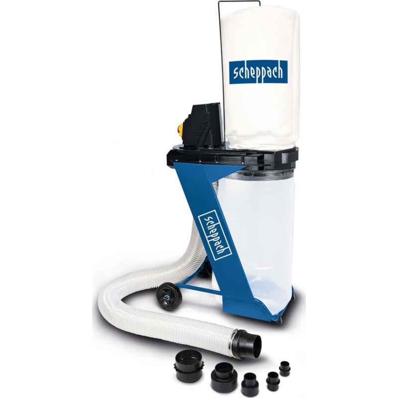 Der Schlauch mit einem Durchmesser von 100 mm und ein 4-teiliges Adapterset ermöglichen den Anschluss des Absaugsystems DC500 von Scheppach an viele verschiedene Maschinen, und mit einer Saugleistung von 1150 m³/h befördert es zuverlässig große Mengen an Spänen in den 75-Liter-Behälter/Sack. Beim Sägen, Schleifen und Hobeln bleibt die Werkstatt nahezu staubfrei.