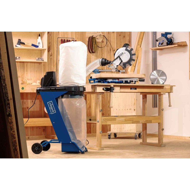 leistungsstarke 550-W-Motor des Absaugsystems DC500 sorgt für ausreichend Leistung, um die Werkstatt frei von Staub und Spänen zu halten, die beim Arbeiten mit Bandsägen und Tischfräsen entstehen.