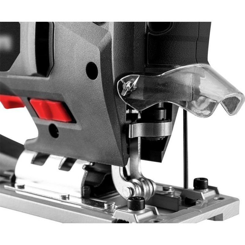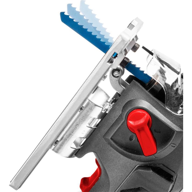 Stichsäge 600 W, Hubzahl 800–3000/min, Neigungswinkel des Sockels 0–45° nach rechts/links, Schnitttiefe in Holz/Stahl 80/8 mm, Sägeblatthub 18 mm, Pendelbewegung des Sägeblatts 0–III, Aluminium-Sockel, werkzeugloser Sägeblattwechsel, Gummigriff, Vorritzfunktion, Zubehör: Führungsschiene, Spezialschlüssel, Sägeblatt, Staubabsaugaufsatz. Gewicht 1,72 kg