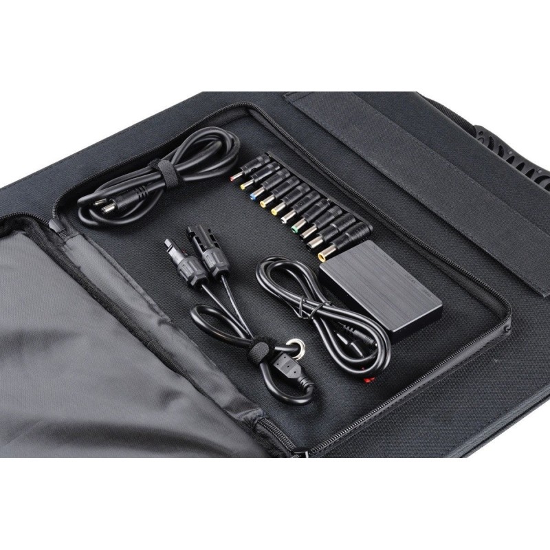 Es ist eine hervorragende Lösung für Situationen, in denen kein Zugang zu Strom besteht, beispielsweise bei Ausflügen in die Natur oder beim Camping, und wir unsere Powerbank oder ein anderes elektrisches Gerät aufladen müssen. Es besteht aus vier monokristallinen Modulen, die zusammengeklappt die Form eines Koffers bilden, was den Transport und die Aufbewahrung erleichtert.