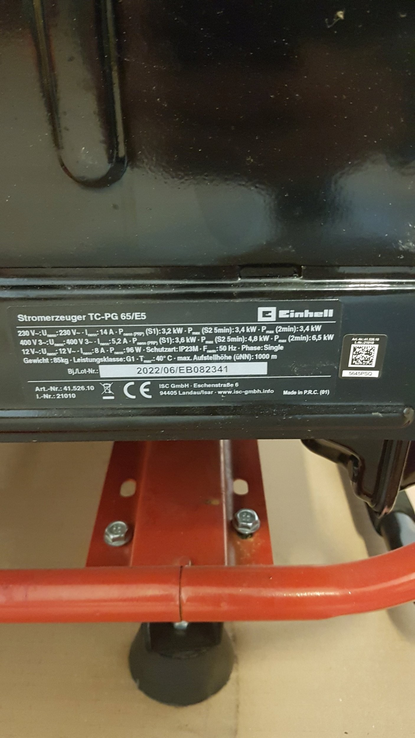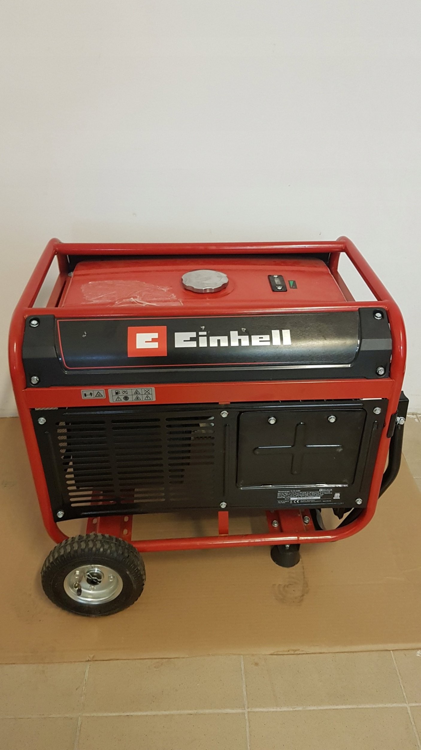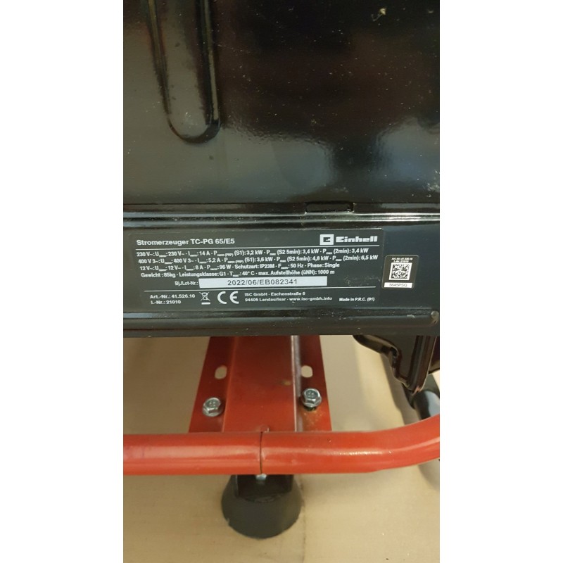 Einhell TC-PG 65/E5. Benzintankinhalt: 25 l, Kraftstoffart: Benzin, Betriebsdauer bei 2/3 Beladung: 11,7 h. Produktfarbe: Schwarz, Rot. Produktgewicht: 79 kg