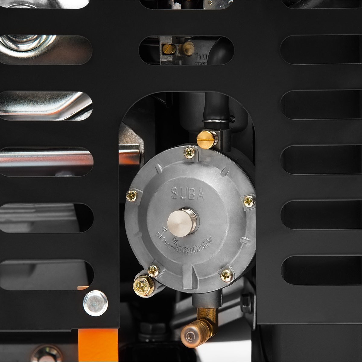 - Das Dual-Fuel-System ermöglicht die zusätzliche Nutzung eines flüssigen Propangas-/Butangasgemischs als Energiequelle. Das Gas wird in der Brennkammer des Motors fast vollständig verbrannt, wodurch während des Betriebs weniger giftige Abgase ausgestoßen werden und sich die Lebensdauer des Motors um bis zu 1,5-mal verlängert. Die Einsparungen bei den Betriebskosten eines Zweistoffaggregats im Vergleich zu einem Benzinaggregat betragen zwischen 50 und 65 %.
