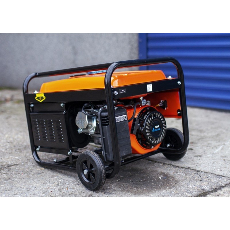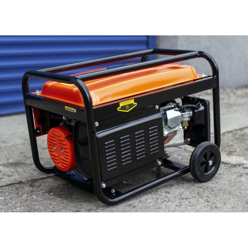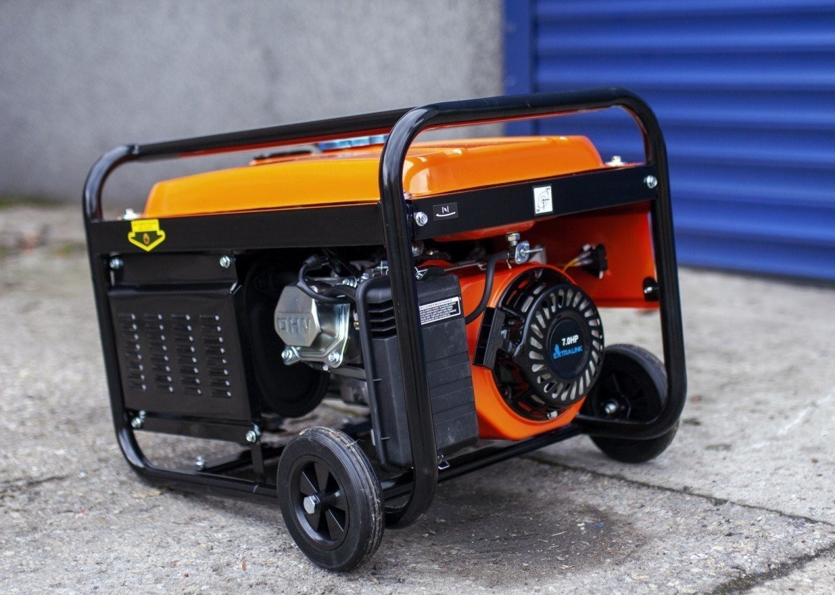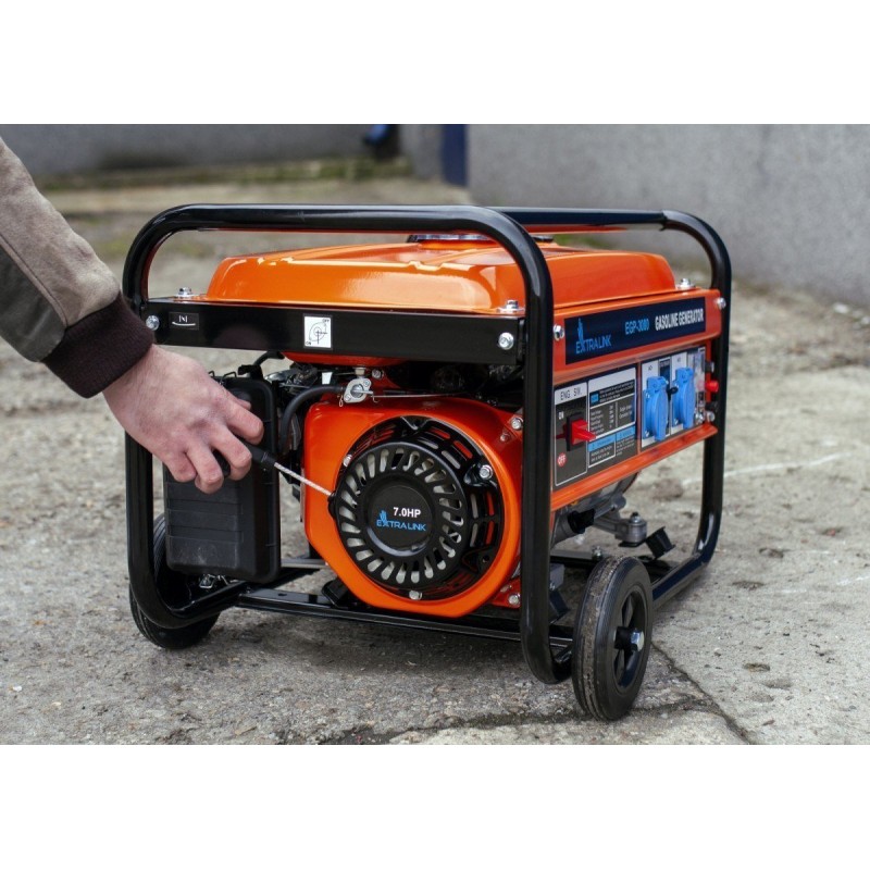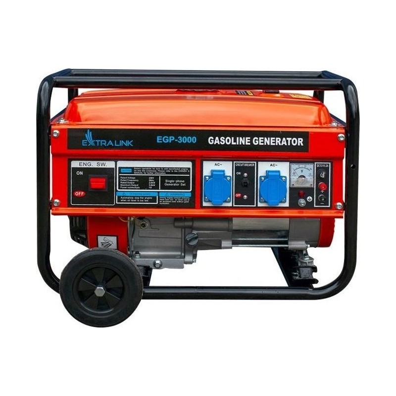 Der Stromgenerator mit Benzinmotor ist mit einem robusten Stahlrahmen ausgestattet, der den Generator vor verschiedenen Arten von Beschädigungen schützt. Robuste Räder und stabile Griffe ermöglichen einen einfachen Transport des Extralink-Benzingenerators.