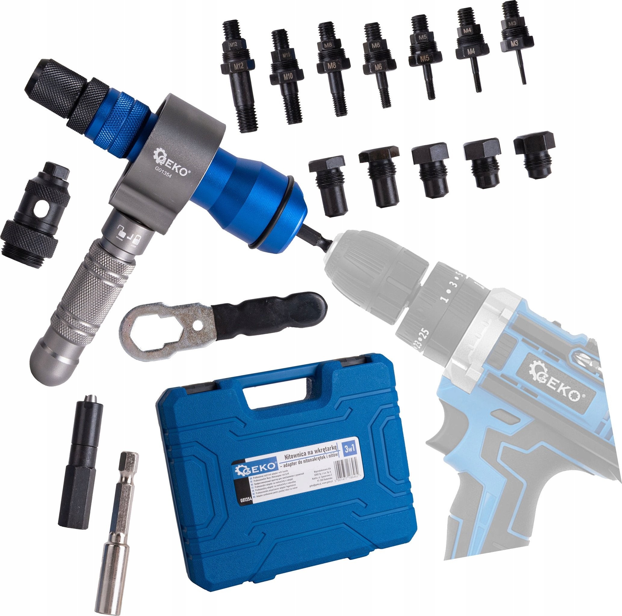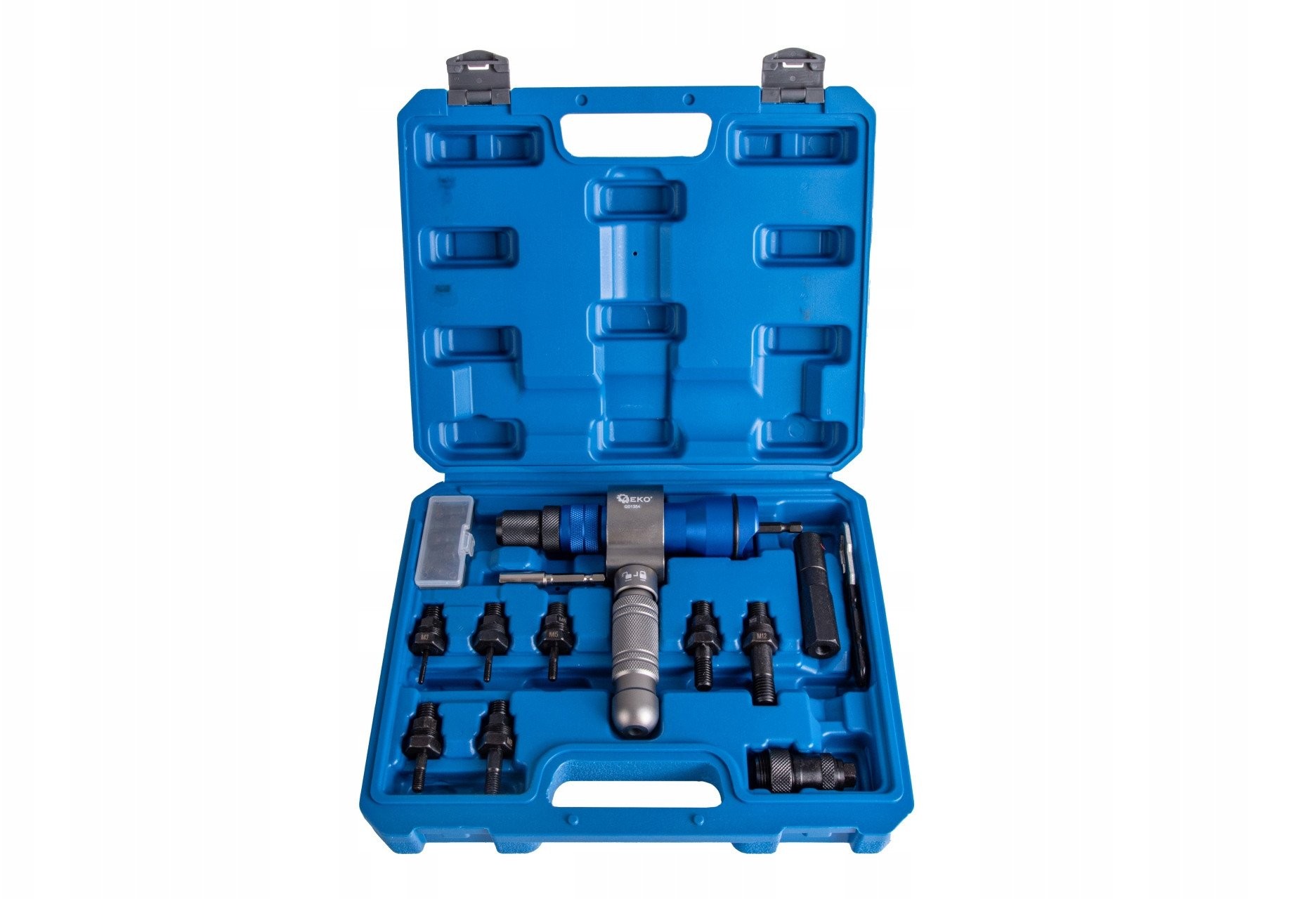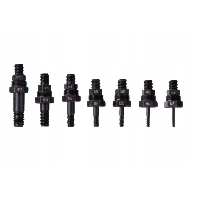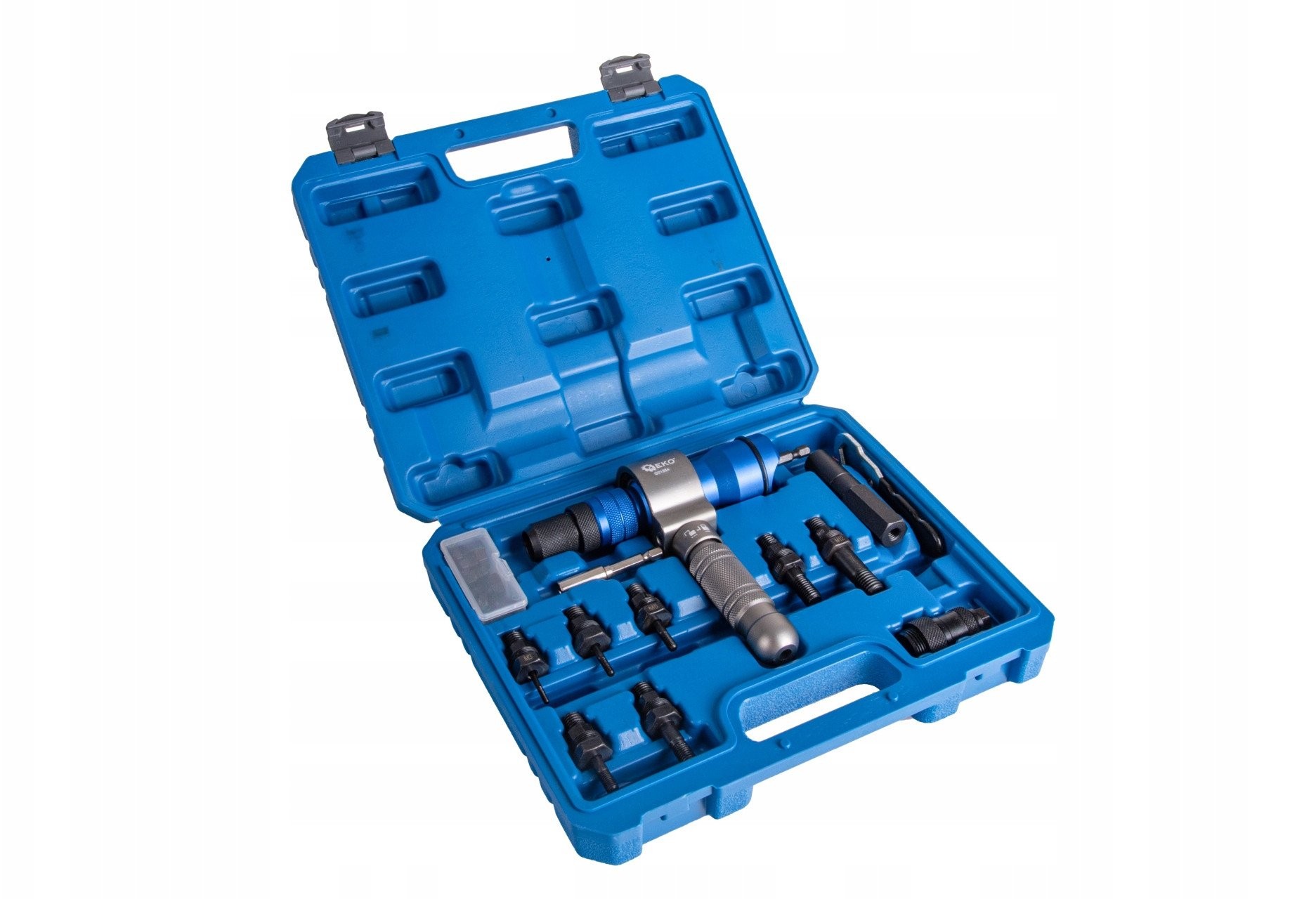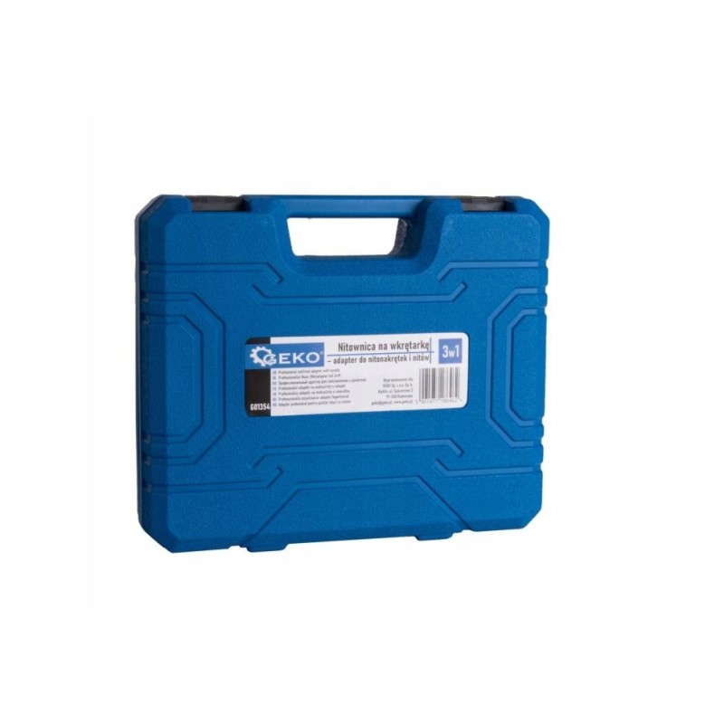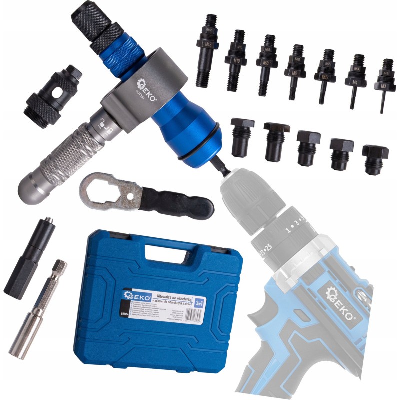 - Im Lieferumfang enthalten: Nietmaschine, Adapter, Aufbewahrungs- und Transportkoffer, Köpfe und Muttern: M3, M4, M5, M6, M8, M10, M12, Köpfe: 2,4 mm, 3,2 mm, 4,0 mm, 4,8 mm, 6,0 mm, 6,4 mm