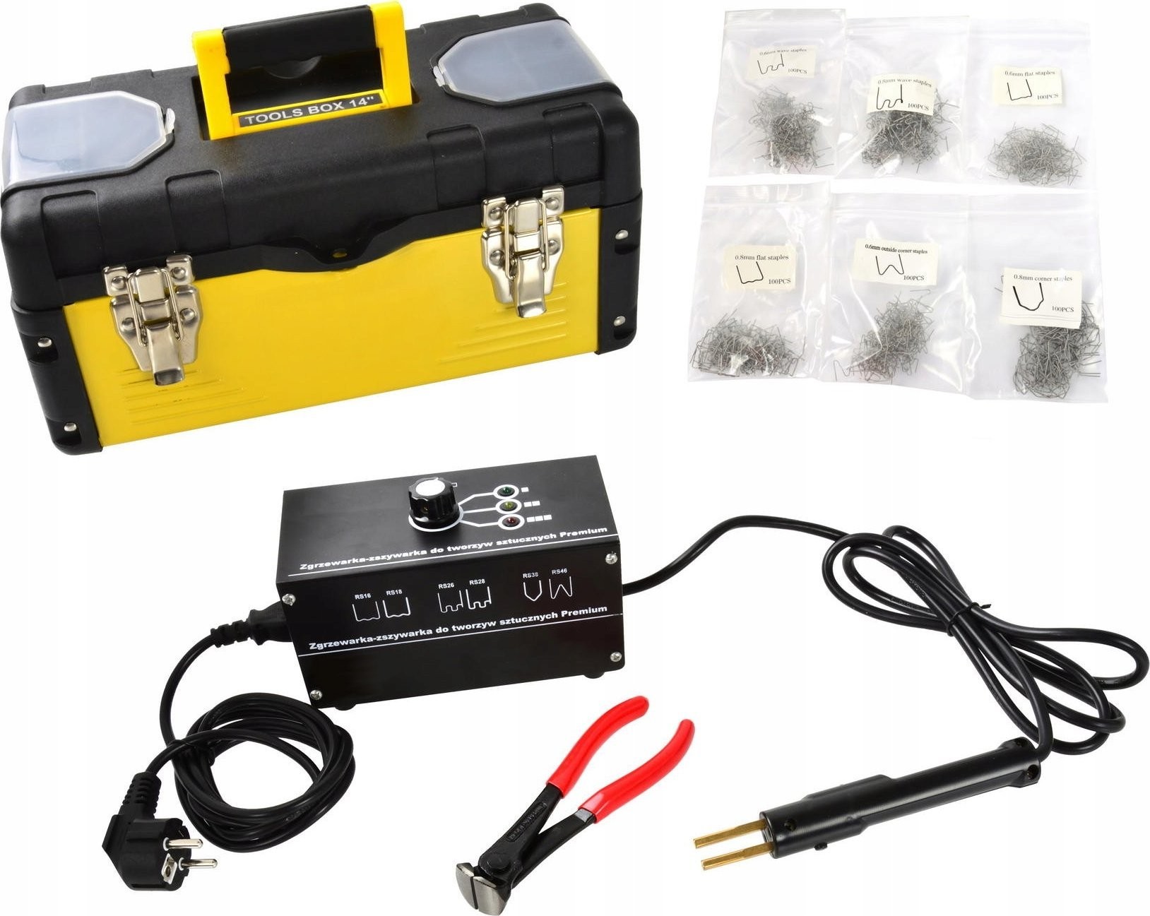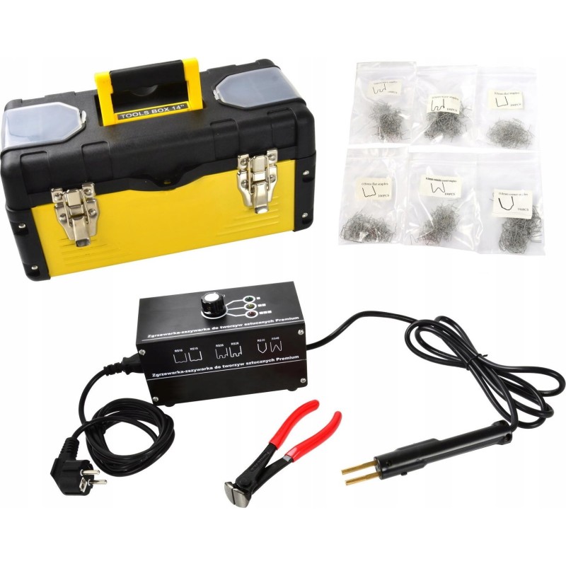 Es eignet sich hervorragend für die Reparatur von gebrochenen Kunststoffteilen an der Karosserie von Autos, an Motorradverkleidungen sowie an verschiedenen Haushaltsgeräten. Im Lieferumfang ist ein Set mit Edelstahlklammern enthalten (drei Klammertypen in zwei Größen, insgesamt 600 Stück).