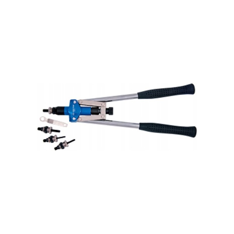 Die Nietzange ist für Stahl- und Aluminium-Blindnietmuttern vorgesehen. Der Körper und der Griff der Nietzange bestehen aus geschmiedetem Aluminium, während die Nietelemente aus Edelstahl gefertigt sind. Die Nietzange verfügt über eine Hebelkonstruktion der Arme. Diese Konstruktion ermöglicht eine maximale Ausnutzung der Presskraft des Nieters für Nietmuttern und garantiert eine erhöhte Bruchkraft bei geringerem Kraftaufwand. Das Werkzeug ist für den professionellen Einsatz in Werkstätten vorgesehen. Im Lieferumfang enthalten sind vier Aufsätze für Blindnietmuttern mit unterschiedlichen Durchmessern sowie der zum Austausch erforderliche Schlüssel. Die Griffe sind mit Kunststoff überzogen, was einen sicheren Halt des Werkzeugs gewährleistet. Die langen Arme und die hervorragende Ausbalancierung der Nietzange verbessern die Arbeitsergonomie erheblich.