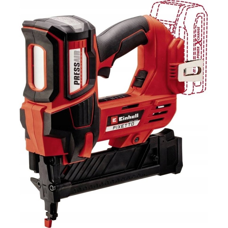 Der professionelle Akku-Tacker Einhell FIXETTO 18/38 S treibt die Klammern mit hoher Kraft in das Material. Der Tacker arbeitet mit der PressAir-Technologie. Die Luft wird direkt im Werkzeug komprimiert, um die Klammer mit dem richtigen Druck „abzuschießen“. Im Vergleich zu anderen Tacker sind weder ein Kompressor noch eine Kartusche erforderlich