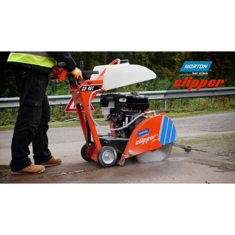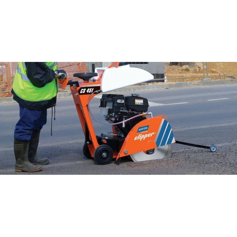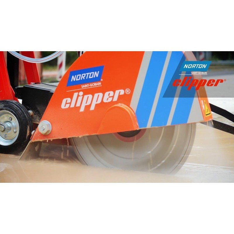 NORTON CLIPPER Saw CS7.5 E Sie wurde ausschließlich für das Schneiden von Asphalt, frischem oder ausgehärtetem Zement (einschließlich Stahlbeton) sowie Industriezement entwickelt. Handgeschoben mit Mechanismus zum Anheben und Absenken des Rades.
