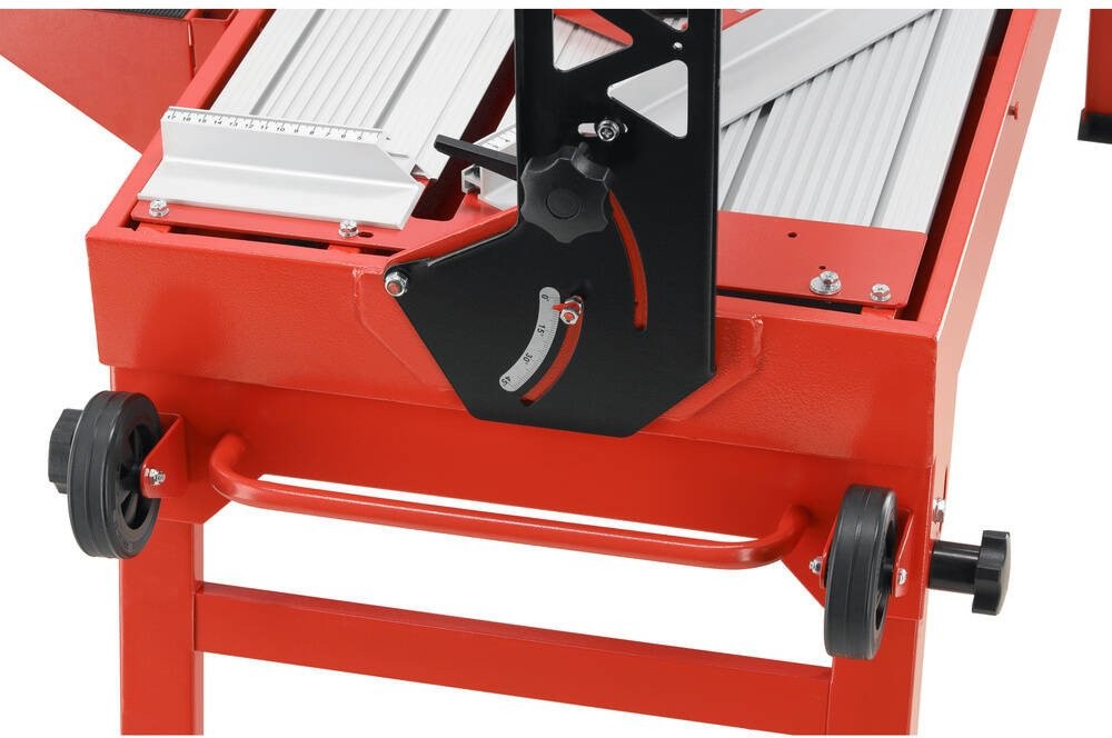 Das Gerät verfügt über einen robusten Arbeitstisch mit zusätzlichen Auflagen, wodurch das Schneiden großer, großformatiger Platten mit Abmessungen von bis zu 1200 x 600 mm möglich ist. Die stabile Konstruktion mit vier klappbaren Beinen sorgt für Sicherheit und Komfort bei der Nutzung.