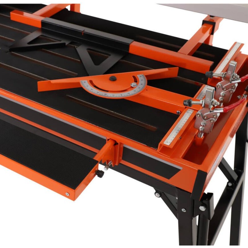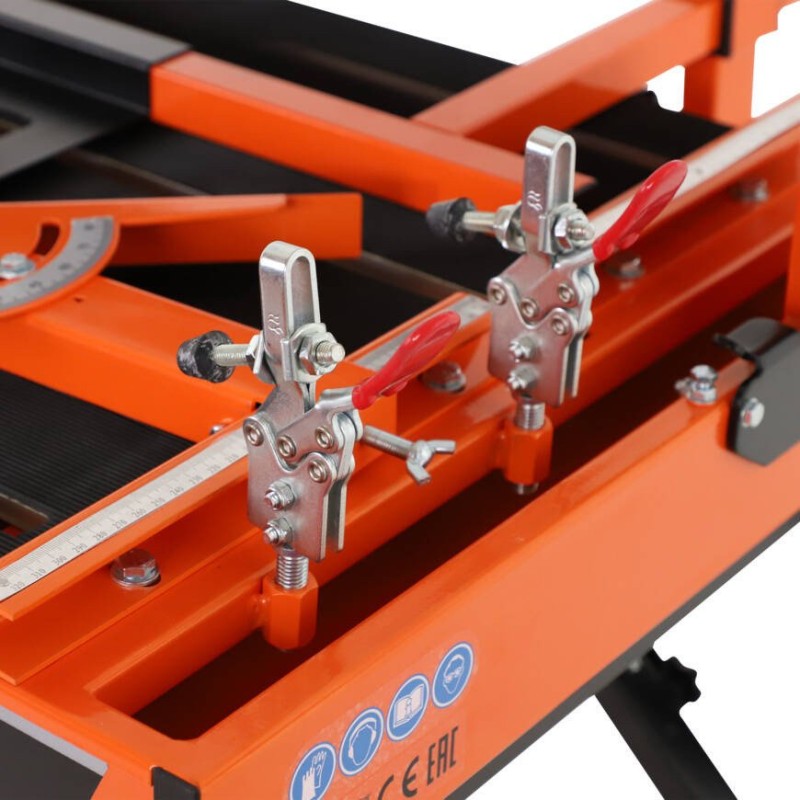 Professionelle 1,1-kW-Fliesenschneidemaschine. Geeignet zum Schneiden von Fliesen mit einer maximalen Größe von 120 cm (85 x 85 cm diagonal). Der verstärkte Rahmen und die Führung des Schneidkopfes sorgen für sehr präzise Schnitte. Der mit Gummi beschichtete Tisch und zusätzliche Spannvorrichtungen verhindern Vibrationen und gewährleisten höchste Schnittqualität. Komplett ausgestattet mit allem notwendigen Zubehör (z. B. Führungen, Norton Clipper-Sägeblatt)
