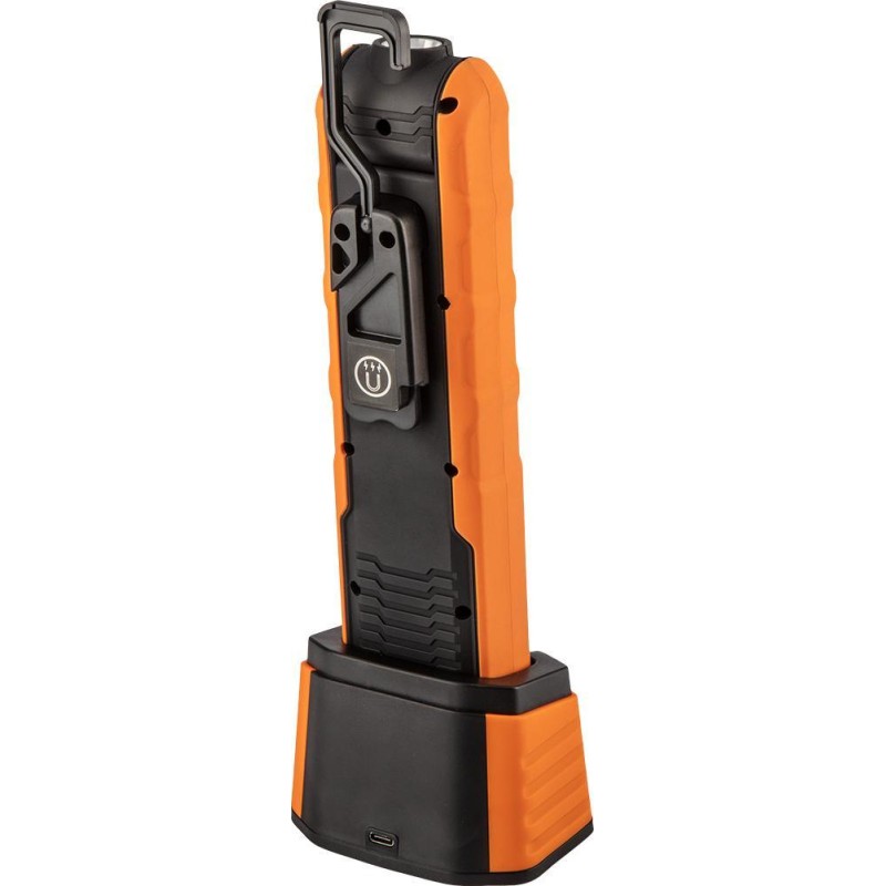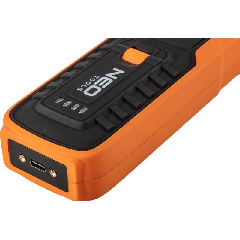 Die Akku-Werkstattlampe NEO (Art.-Nr. 99-065) ist mit einer COB-LED mit einem Lichtstrom von 500 Lumen und einer Leistung von 5 W + 1 W ausgestattet. Dank des schwenkbaren Kopfes kann sie sowohl als Taschenlampe als auch als Leuchte verwendet werden. Sie wird mit dem im Lieferumfang enthaltenen 3,7-V-Li-Ionen-Akku mit einer Kapazität von 2600 mAh betrieben. Das Aufladen erfolgt über die Ladestation, die gleichzeitig als Ständer dient, um die Leuchte aufrecht zu halten. Die Leuchte kann an einem integrierten Haken aufgehängt oder mit einem Magneten befestigt werden.