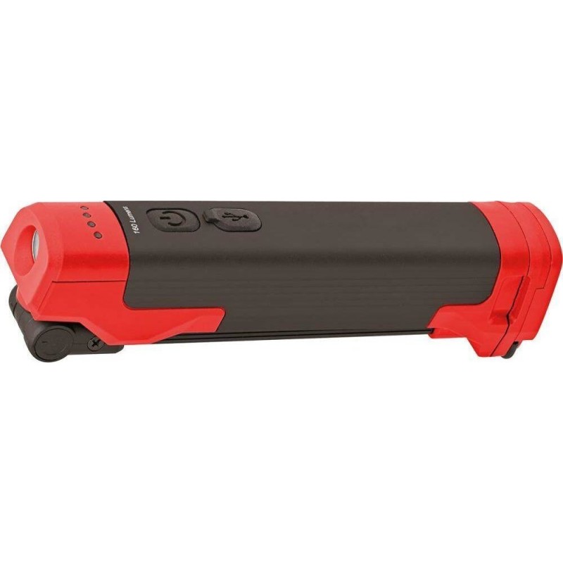Klappbare LED-Taschenlampe, akkubetrieben Ausführung: Gehäuse aus Aluminium, mit Magnet am Sockel. Dank der im Sockel integrierten Halterung und dem ausklappbaren Haken lässt sich die Lampe zudem fast überall befestigen. Stufenlos dimmbares Hauptlicht in Form eines COB-LED-Panels und SMD-LED-Spotlicht. Der Lampenkopf verfügt über einen zusätzlichen Magneten am Spotlicht und ist um 180° neigbar sowie frei um 180° drehbar. Eingebauter Lithium-Ionen-Akku 3,7 V/2600 mAh. Lieferung inklusive USB-Ladekabel.