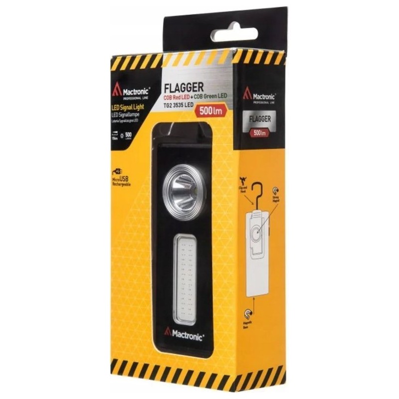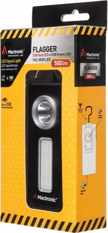 TECHNISCHE DATEN:Betriebsdauer Hauptlampe:500 lm – 2 h 30 min150 lm – 6 hBetriebsdauer rote Lampe:Constant – 7 h 30 minFlash – 15 hBetriebsdauer grüne Lampe:Dauerlicht – 7 h 30 minBlinklicht – 15 hLichtquelle: LED + COB rote LED + COB grüne LEDStromversorgung: Akku | USB-CStromversorgung: Eingebauter Li-Poly-Akku 3,7 V 1500 mAhGewicht [g]: 109Abmessungen [mm]: 107, 5 x 47 x 36,5 IP – Schutzart: IPX3 Fokus: Nein Lieferumfang: Taschenlampe USB-C-Kabel Die Mactronic Flagger wurde in ihrer neuesten Version um Lösungen zur Verbesserung der Ergonomie der Taschenlampe erweitert. Die Taschenlampe verfügt über drei verschiedene Leuchtmodi. Die Haupt-LED erzeugt maximal 500 lm, wodurch Objekte in einer Entfernung von bis zu 154 m beleuchtet werden können. Die Helligkeit der weißen LED lässt sich über die ADS-Funktion anpassen, die eine stufenlose Regulierung des Lichts im Bereich von 150 bis 500 lm ermöglicht. Die grünen und roten COB-LEDs dienen als Signalleuchten und werden über separate Tasten bedient. Diese Beleuchtung eignet sich hervorragend zur Verkehrsregelung. Der integrierte Lithium-Polymer-Akku ermöglicht einen Dauerbetrieb des Geräts von bis zu 15 Stunden. Die Flagge lässt sich einfach über den USB-C-Anschluss aufladen. Die kompakte Bauweise des Gehäuses ermöglicht verschiedene Befestigungsmöglichkeiten. Dank eines starken Magneten lässt sich die Taschenlampe problemlos an jeder metallischen Oberfläche befestigen. Das Gerät ist mit einem Clip/Haken ausgestattet, mit dem es während Kontroll- und Reparaturarbeiten sowie unter Feldbedingungen am Gürtel oder in der Hemd- oder Jackentasche befestigt werden kann. Der Flagger wurde mit ölbeständigen Tasten entwickelt, was ihn in Kombination mit den vielfältigen Befestigungsmöglichkeiten zu einem zuverlässigen Begleiter in jeder Situation macht.**