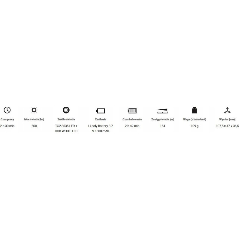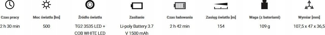 TECHNISCHE DATEN:Leuchtdauer Hauptlampe:500 lm – 2 h 30 min150 lm – 6 hLeuchtdauer rote Lampe:Dauerlicht – 7 h 30 minBlinklicht – 15 hLeuchtdauer grüne Lampe:Dauerlicht – 7 h 30 minBlinklicht – 15 hQuelle