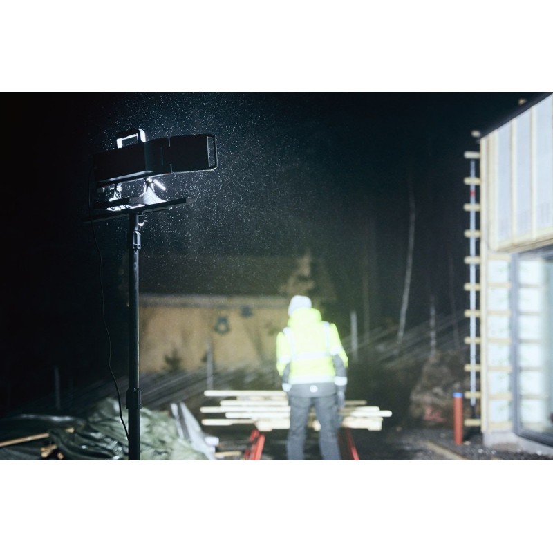 Die Arbeitsleuchte verfügt über 3 neigbare Lichtpaneele, die ein extrem starkes Licht von bis zu 20.000 Lumen abgeben. Das Produkt ist mit einer App kompatibel, die es dem Benutzer ermöglicht, die Beleuchtung über sein Smartphone zu steuern. Mit der App kann man die Leuchte ein- und ausschalten, die Lichtstärke regulieren (dimmen) und einen Timer programmieren, wobei bis zu 100 Einheiten parallel verbunden werden können. Eine zusätzliche Funktion ist der Bewegungssensor, der sich in der mitgelieferten Steuerbox befindet, sodass sich die Leuchte einschaltet, sobald sich eine Person im Umkreis von 5 Metern um die Leuchte befindet. Sie schaltet sich aus, sobald der Bereich von 5 Metern verlassen wird. Diese Funktion kann deaktiviert werden. Darüber hinaus ist die Leuchte dank der Schutzart IP 65 wasserdicht.