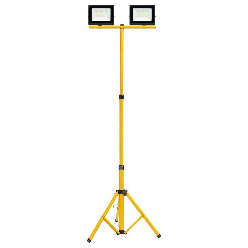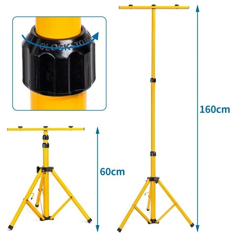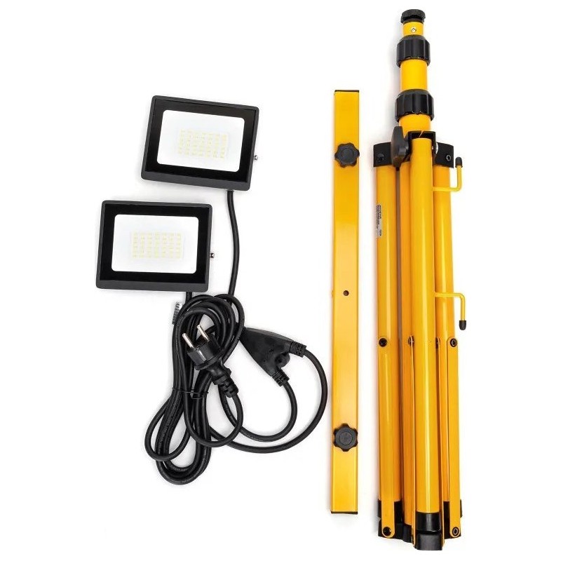Zusammenklappbares Stativ mit zwei LED-Halogenlampen à 30 W. Die Höhe des Stativs ist von 60 bis 160 cm verstellbar. Das Stativ ermöglicht die Einstellung der Höhe und der Ausrichtung der Beleuchtung. Die Halogenlampen müssen an den dafür vorgesehenen Halterungen befestigt werden. Die Beleuchtung kann je nach Bedarf durch Drehen der Lampen und Verstellen der Stativhöhe angepasst werden.