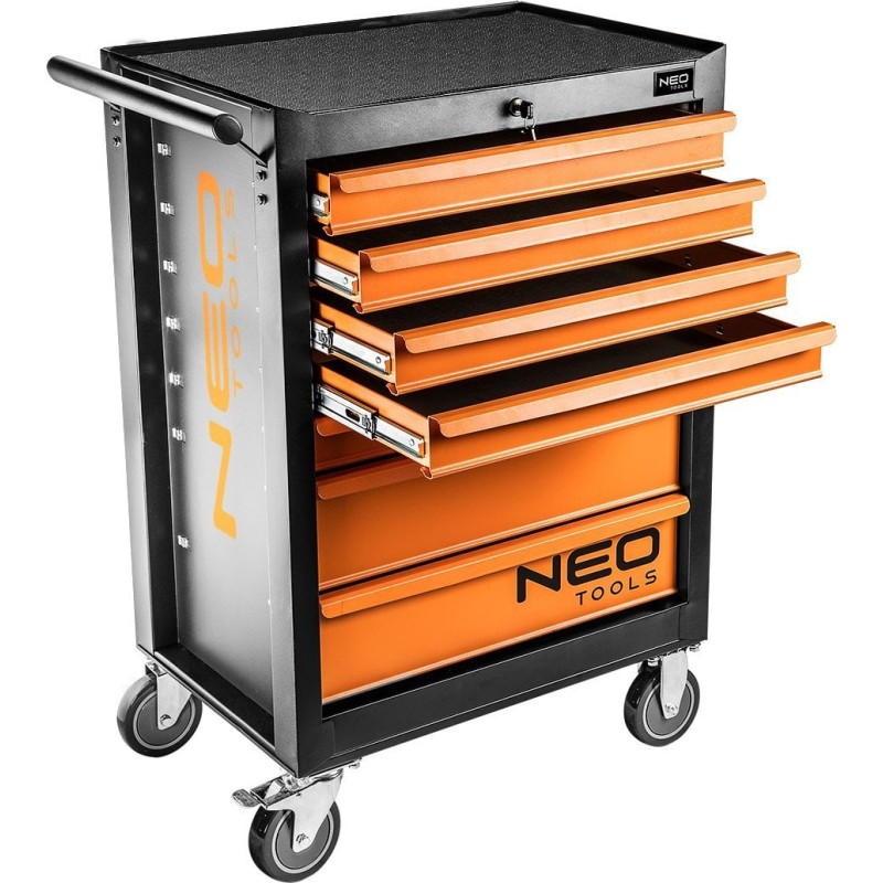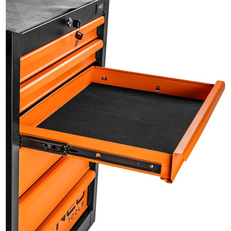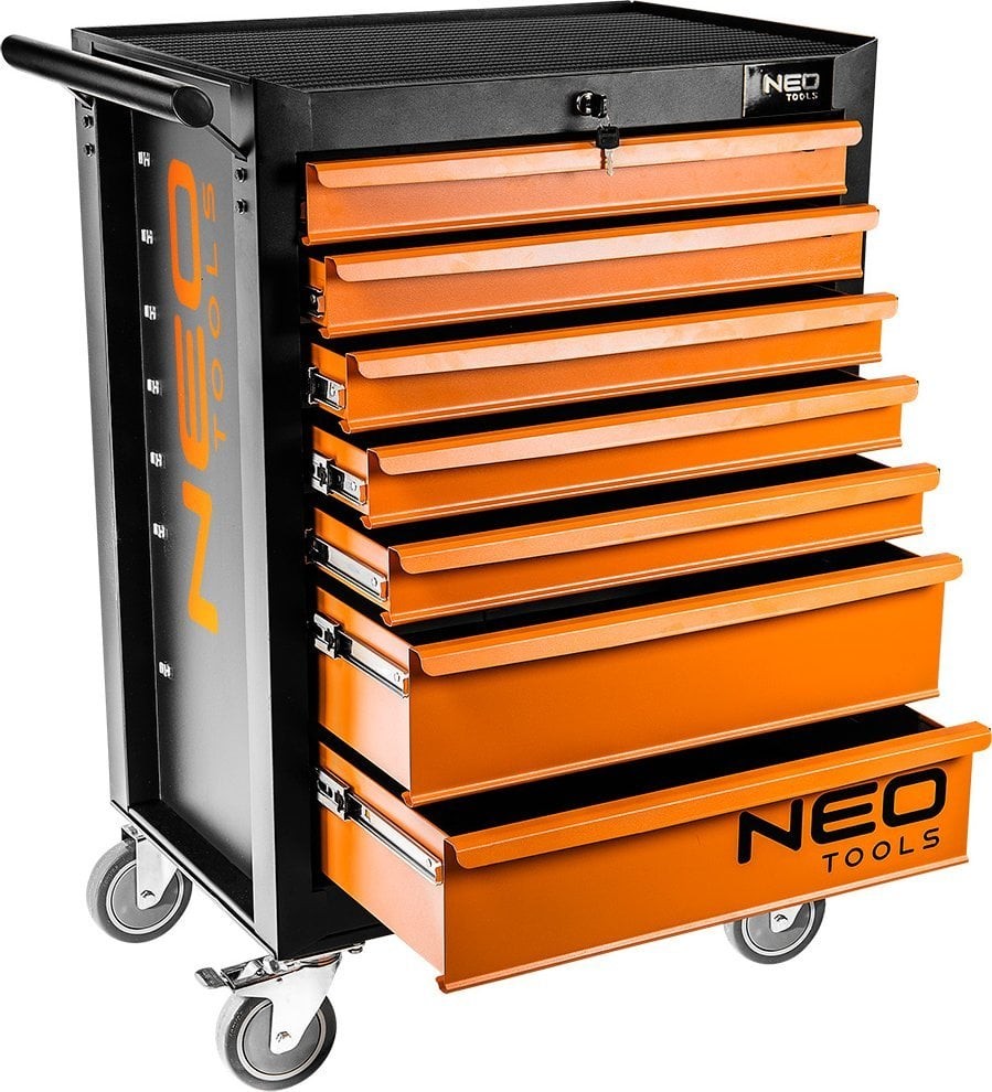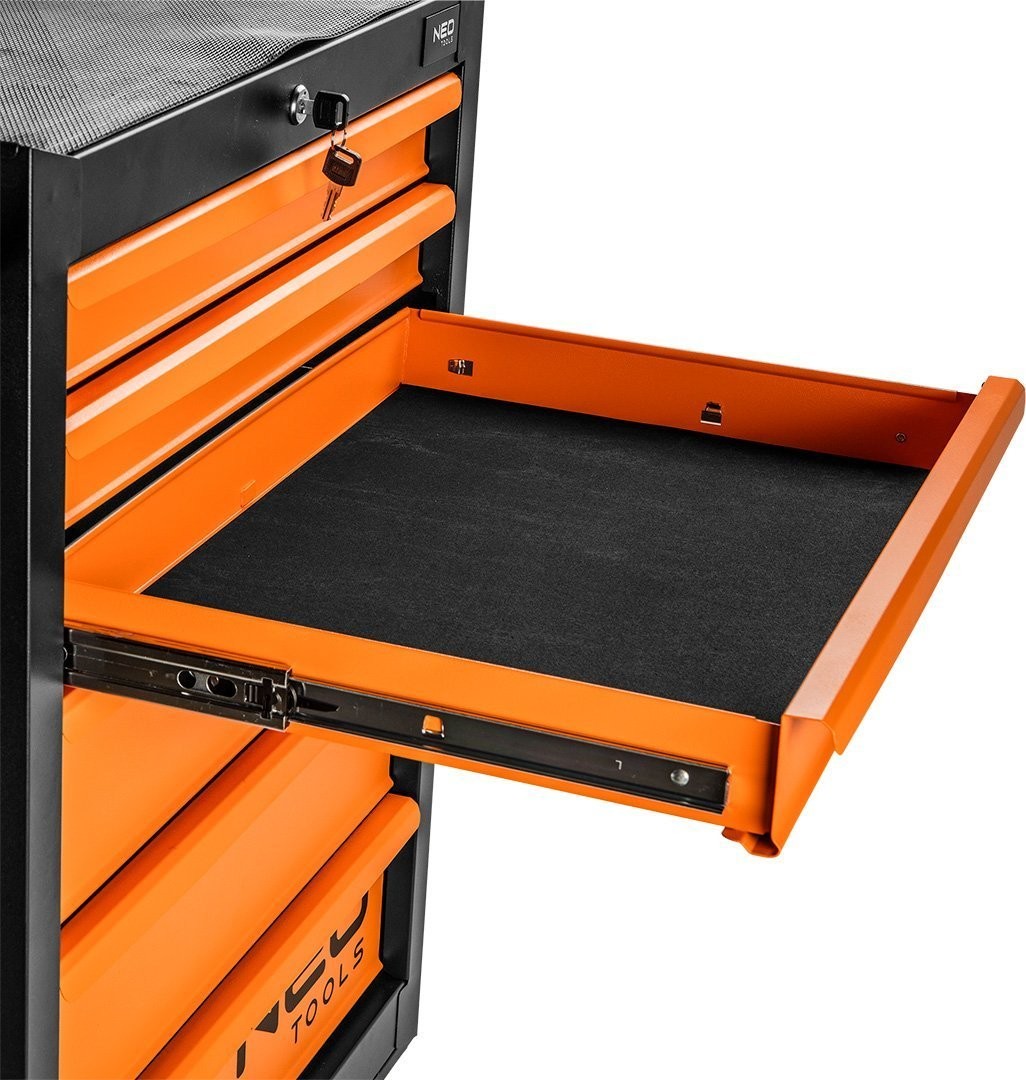 Der Werkstattschrank, 7 Schubladen + 129 Werkzeuge 84-222-9 der Marke NEO TOOLS ist ein Schrank mit Zusatzausstattung mit den Maßen 680 x 460 x 1030 mm und einer Tragkraft von 280 kg. Er verfügt über einen soliden Stahlkorpus, ein Zentralschloss, eine Gummiauskleidung auf der Arbeitsplatte sowie Kugelführungen. Dank der Räder mit großem Durchmesser (125 mm) und dem seitlichen Griff lässt er sich leicht transportieren. Das Zentralschloss schützt den Inhalt.