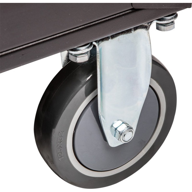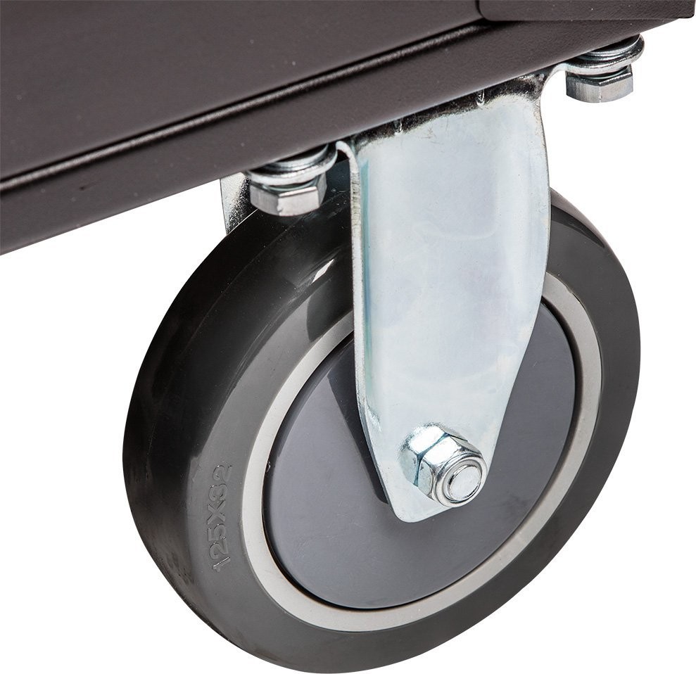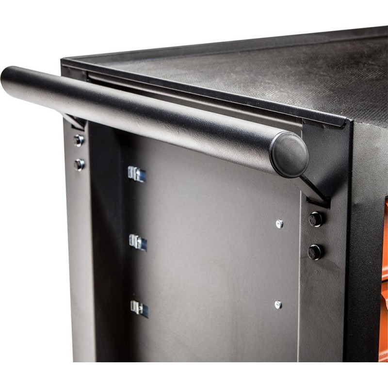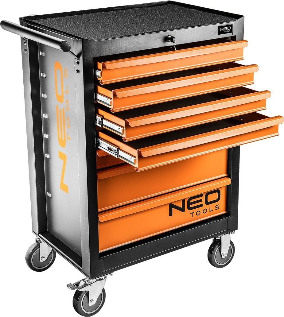 Der Werkstattschrank, 7 Schubladen + 129 Werkzeuge 84-222-9 der Marke NEO TOOLS ist ein Schrank mit Zusatzausstattung mit den Maßen 680 x 460 x 1030 mm und einer Tragkraft von 280 kg. Er verfügt über einen soliden Stahlkorpus, ein Zentralschloss, eine Gummiauskleidung auf der Arbeitsplatte sowie Kugelführungen. Dank der Räder mit großem Durchmesser (125 mm) und dem seitlichen Griff lässt er sich leicht transportieren. Das Zentralschloss schützt den Inhalt.