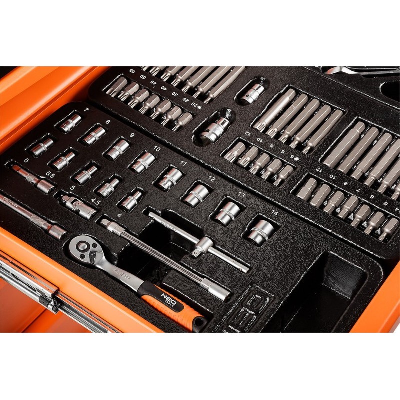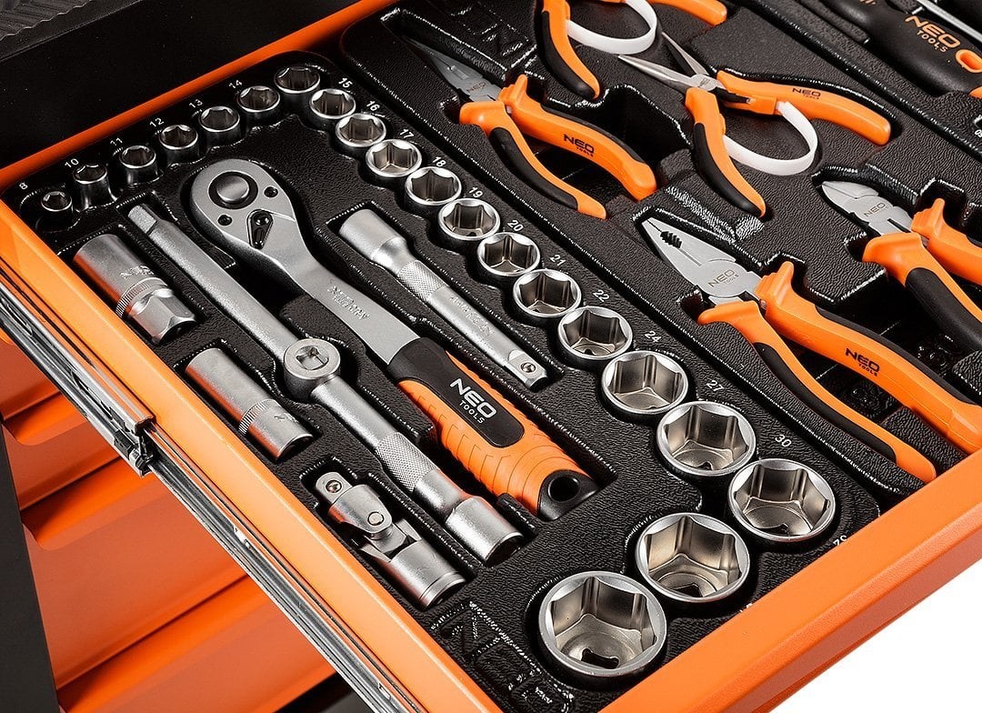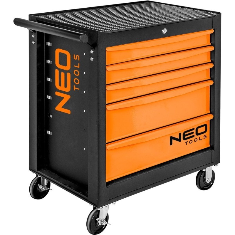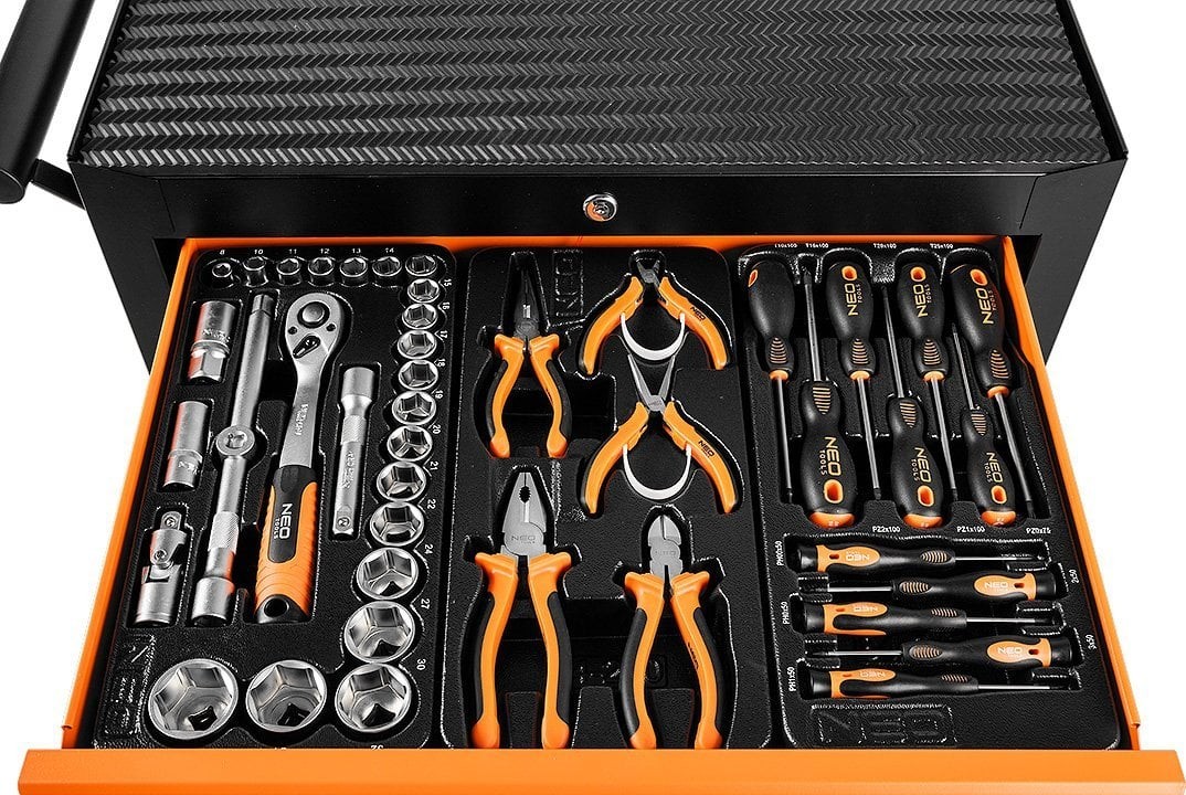 Der Werkzeugschrank, 5 Schubladen + 117 Teile 84-214-6 der Marke NEO TOOLS ist ein Schrank mit Zusatzausstattung mit den Maßen 680 x 460 x 825 mm und einer Tragkraft von 280 kg. Er verfügt über einen soliden Stahlkorpus, ein Zentralschloss, eine Gummiauskleidung auf der Arbeitsplatte sowie Kugelführungen. Dank der Feststellbremse an den Rädern, deren Durchmesser 4” beträgt, und dem seitlichen Griff lässt er sich leicht transportieren. Zwei Schlüssel sichern den Inhalt. Der Schrank wird mit ausgewählten Einsätzen mit den Artikelnummern 84-230, 84-234, 84-236, 84-237, 84-238, 84-247. Es handelt sich um ein umfangreiches NEO TOOLS-Set, das die meisten notwendigen Elemente für mechanische Reparaturen enthält. Der Werkzeugschrank mit Inhalt wird Profis und Heimwerkern empfohlen.