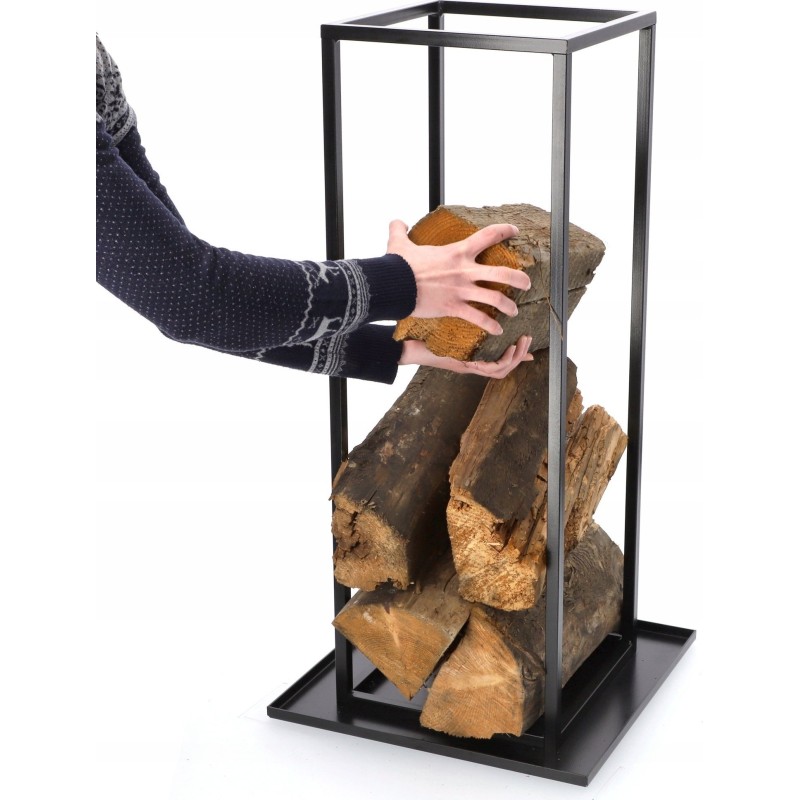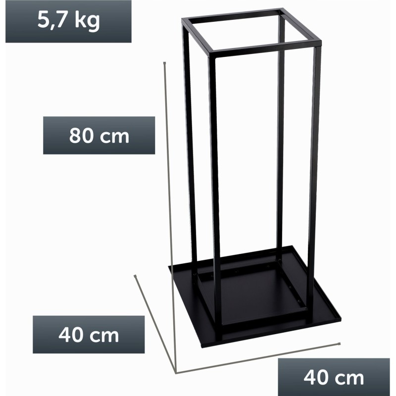 Die Höhe unseres Ständers beträgt 80 cm. Die Breite der Basis beträgt 40 cm, die Innenbreite 25 cm. Das matte Schwarz passt farblich hervorragend zu jedem Einrichtungsstil. Die Basis besteht aus Blech, was sie zu einer starken und soliden Stütze für das Gewicht des gestapelten Holzes macht. Der Ständer lässt sich leicht transportieren – dank vier praktischer Stangen.