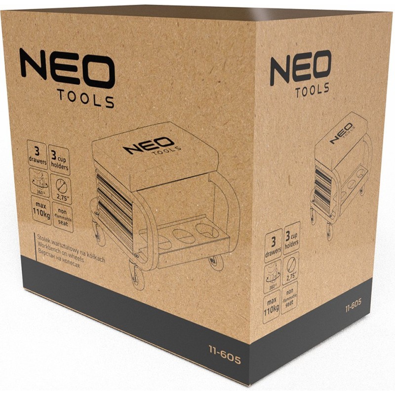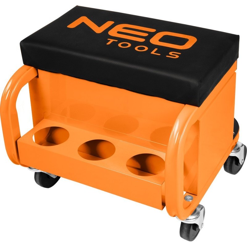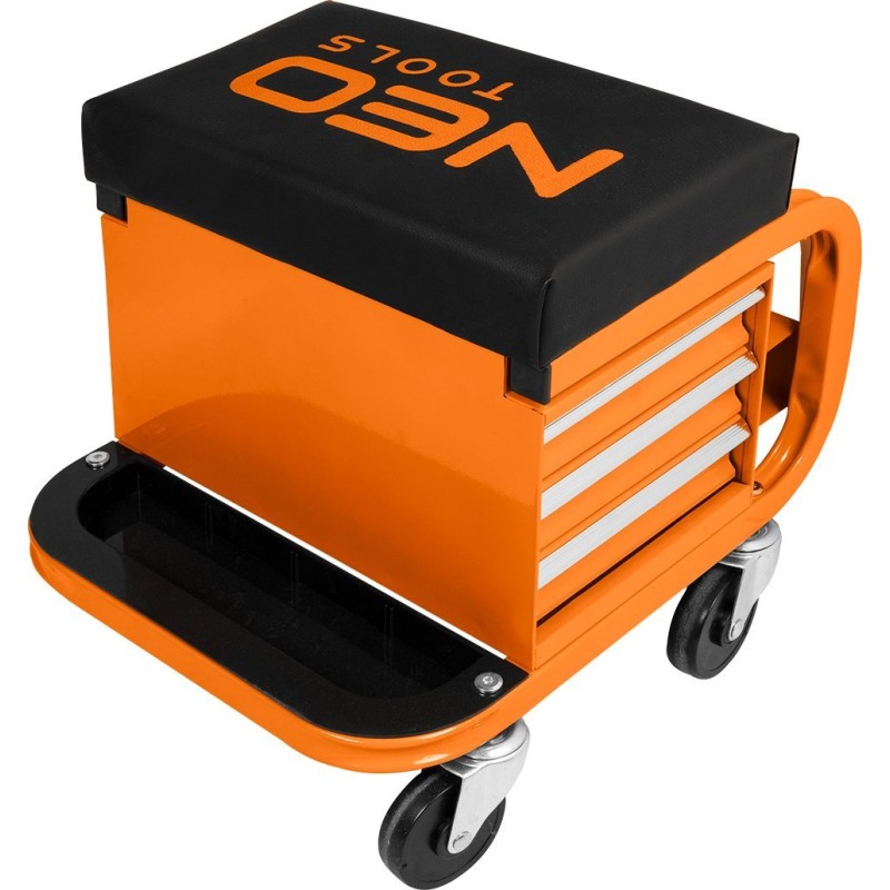 Werkstatthocker auf Rollen mit Schubladen für Werkzeuge, pulverbeschichtet, Tragkraft 110 kg, Abmessungen des Hockers 38 x 37 x 39 cm, Abmessungen der Schublade 30 x 15 x 4 cm, Schaumstoffeinlage in den Schubladen, 4 Rollen (360° drehbar) mit einem Durchmesser von 70 mm, 3 Halterungen für Dosen/Flaschen/Sprays mit einem Durchmesser von 70 mm
