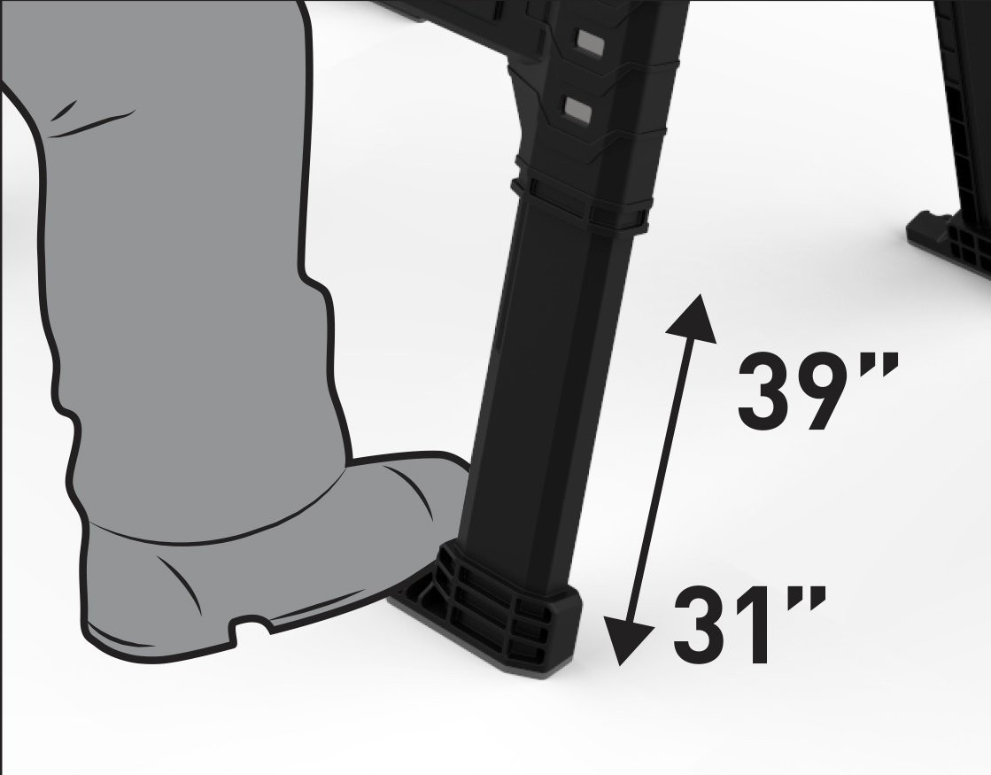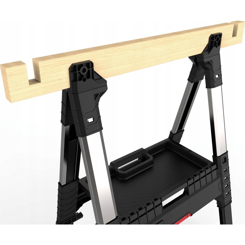 Die Metallbeine halten einer Belastung von bis zu 1360 kg (3000 lbs) stand. Die oberen Querstreben verhindern ein unkontrolliertes Herausspringen des Holzes, und die weit ausklappbaren Fußstützen sorgen für Stabilität auch auf unebenem Untergrund und verhindern ein Verrutschen des Ständers während der Arbeit. Die untere Ablage mit einer Tragkraft von 23 kg dient als Aufbewahrungsort für zugeschnittene Holzstücke.