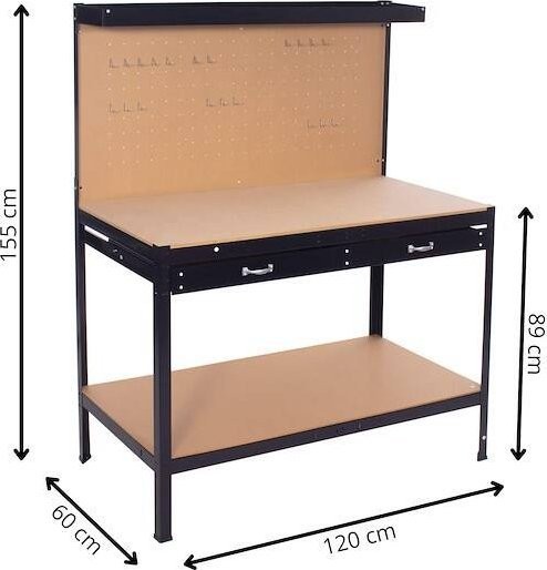 Mit Gesamtabmessungen von 120 x 60 x 155 cm ist die Springos®-Werkbank groß genug, um einen komfortablen Arbeitsbereich zu bieten, und gleichzeitig kompakt genug, um nicht zu viel Platz einzunehmen. Die im Lieferumfang enthaltenen Montageteile erleichtern die Installation des Tisches, und zusätzliche Haken und Ablagen erhöhen seine Nutzbarkeit. Dieses Produkt ist die ideale Lösung für alle, die Ordnung, Organisation und Solidität an ihrem Arbeitsplatz schätzen.