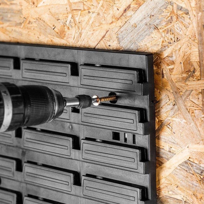 MODULARER AUFBAU – Die große Werkzeugtafel ist modular aufgebaut. Sie besteht aus vielen Elementen, die du frei konfigurieren und um weitere Module erweitern kannst. Die universelle Leiste ermöglicht das Aufhängen von Werkstattbehältern, Regalen sowie Werkzeughaltern.