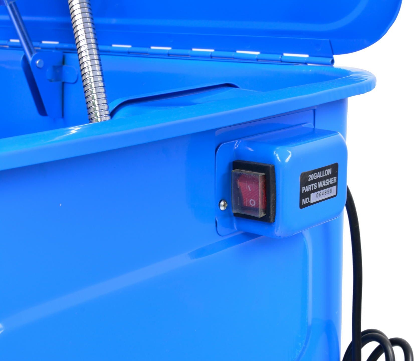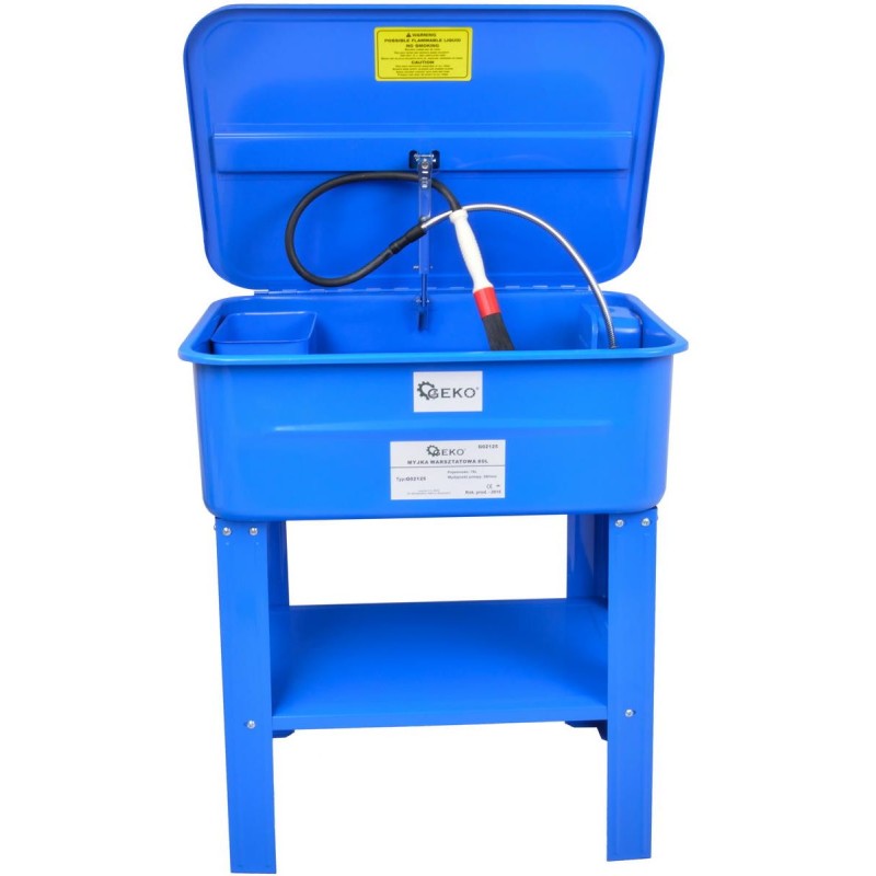 Professionelle stationäre elektrische Werkstatt-Waschmaschine mit 80 Litern Fassungsvermögen Produktmerkmale: Wannenvolumen 80 Liter, zulässige Reinigungsmittelmenge 50 Liter, herausnehmbare Ablage zum Ablegen des zu reinigenden Teils, stabile Abdeckung mit automatischer Stütze, elektrische Pumpe 230 V, Pumpenleistung 10–12 Liter/Min. Gesamtabmessungen innen: 710 x 480 x 260 mm Ablage unter dem Becken: 680 x 420 mm 4 stabile, lackierte Metallfüße flexibler Metallschlauch für den Reinigungsmittelfluss, Länge 50 cm Ablassstopfen am Boden des Beckens