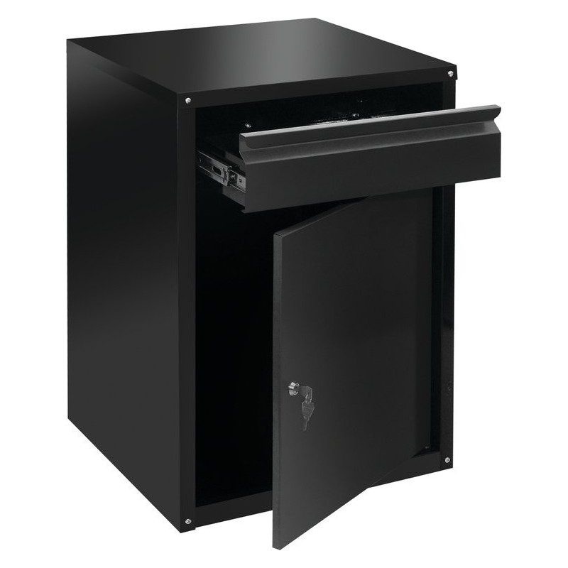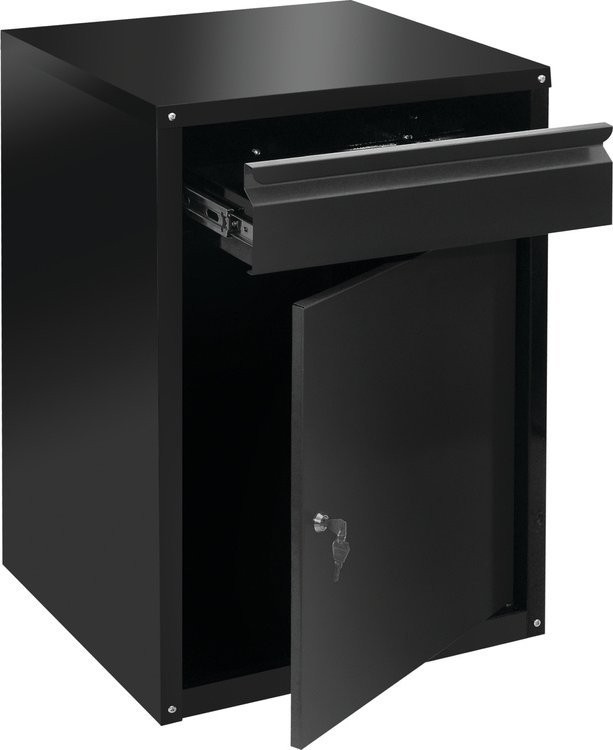 Der Schrank besteht aus einem Korpus mit einer Tür mit Schlüsselverschluss und einer stabilen Schublade auf Kugelführungen.