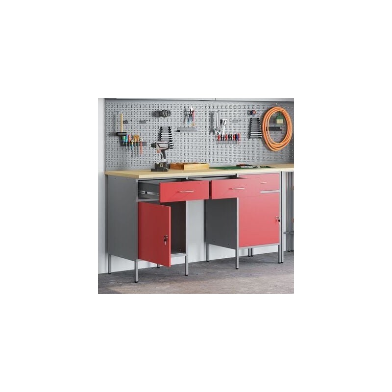 Dieser Arbeitsschrank im Industrial-Stil verbindet Funktionalität mit markantem Design und eignet sich daher ideal für Werkstätten, Garagen und Büros. Er bietet praktischen Stauraum und verleiht dem Raum ein elegantes Aussehen. Die robuste Konstruktion aus Stahl und Holzwerkstoffen sowie die auffälligen Farben Rot und Grau sorgen dafür, dass dieser Schrank nicht nur für Ordnung sorgt, sondern dem Raum auch Stil verleiht.