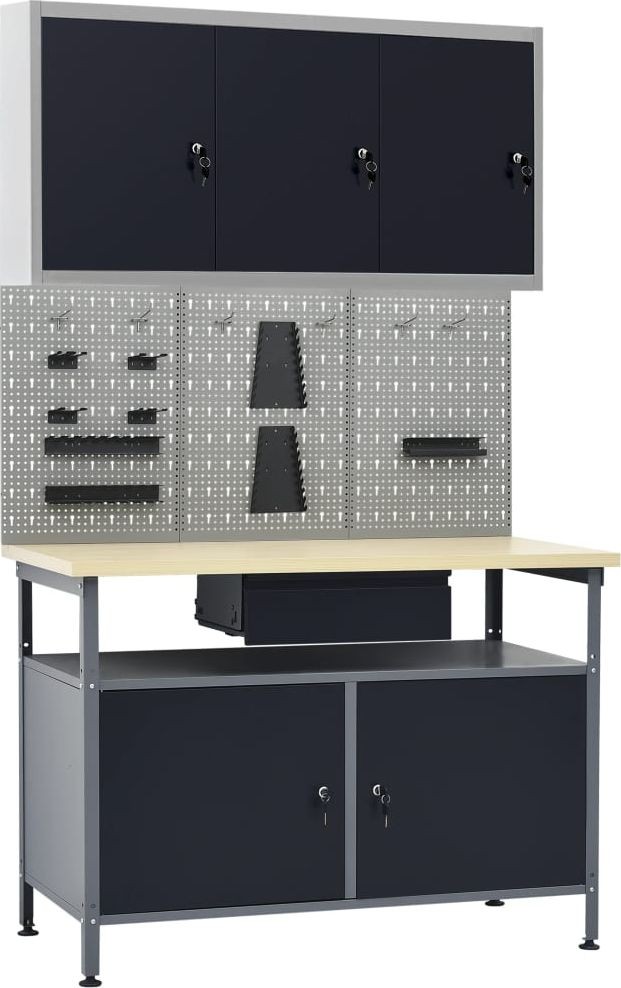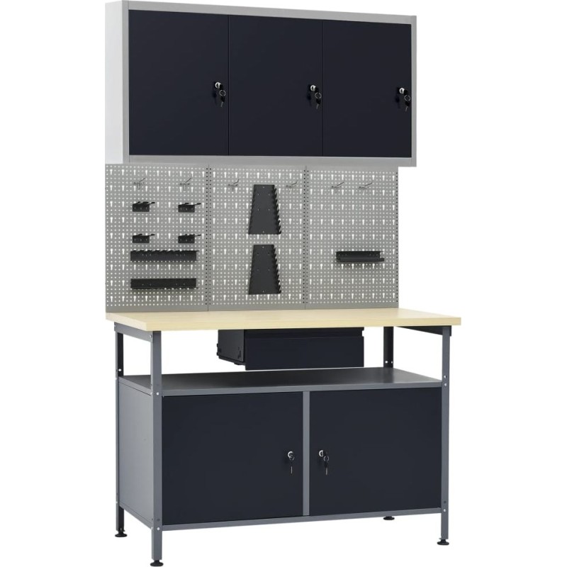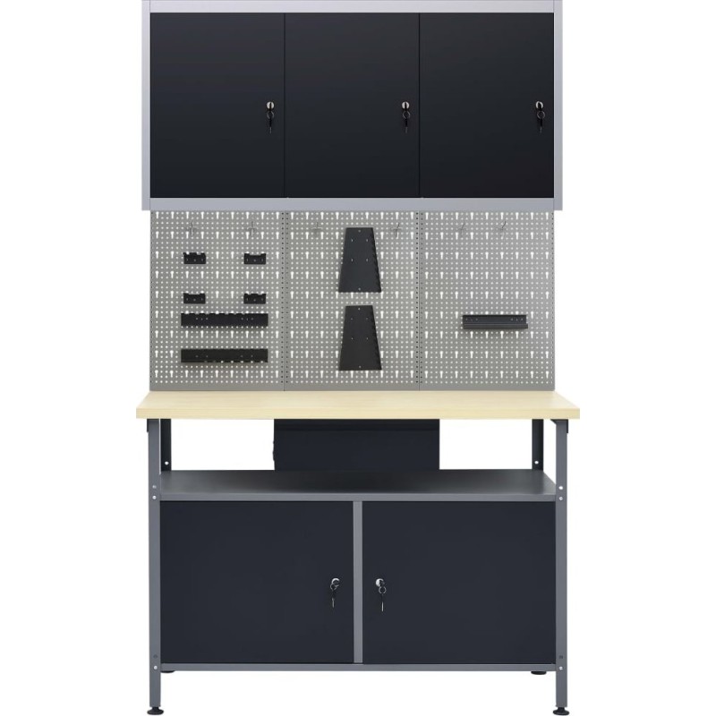 Dieses Set besteht aus 1 Arbeitstisch, 3 Wandpaneelen und 1 Wandschrank und bietet eine praktische Aufbewahrungslösung für die Werkstatt oder Garage.