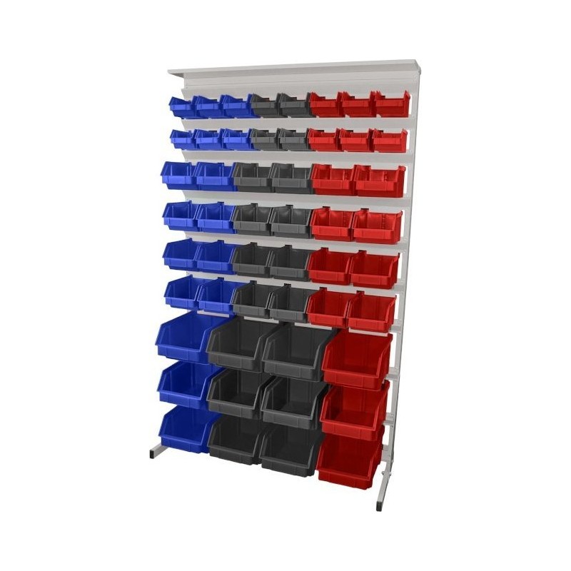 Einseitiges Lagerregal zum Aufhängen von 52 Werkstattbehältern. Ideal zum Ordnen von Werkzeugen und zur Aufbewahrung in praktischen Fächern. Beschriftungsschilder mit Inhaltsangaben auf den Behältern erleichtern die Arbeit und sparen Zeit bei der Suche nach den benötigten Werkzeugen.
