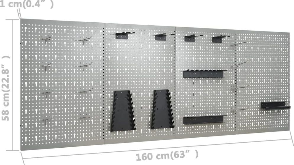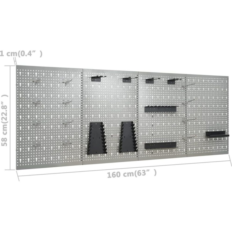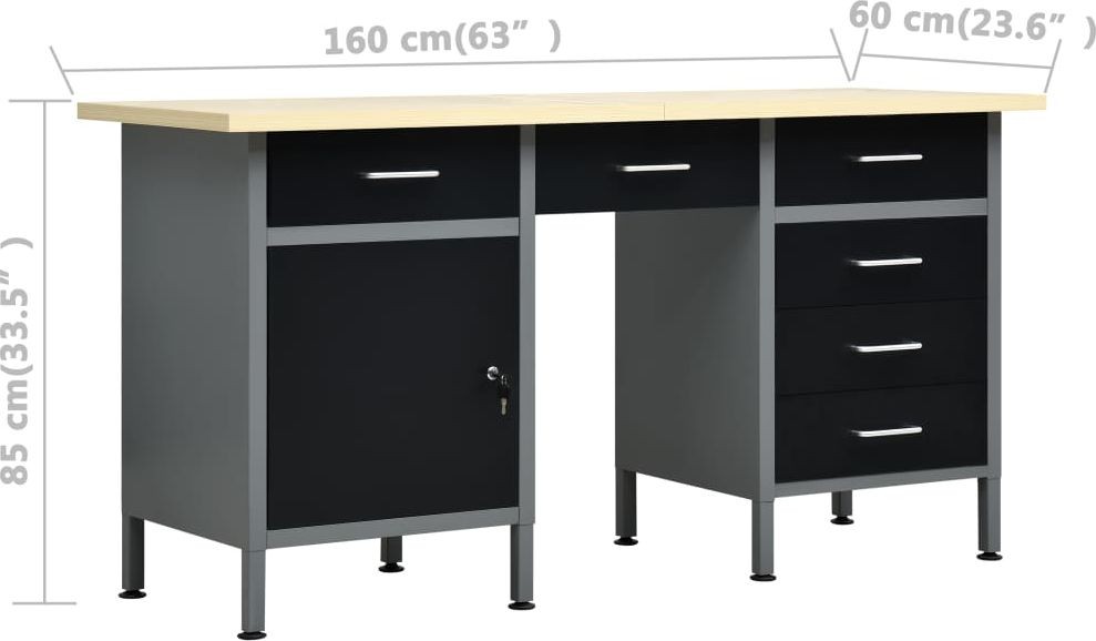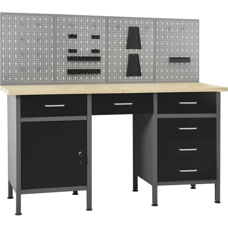 Dieses Set besteht aus 1 Arbeitstisch und 4 Wandpaneelen und bietet eine praktische Aufbewahrungslösung für die Werkstatt oder Garage. Der robuste Arbeitstisch zeichnet sich durch viel Stauraum und eine Tragkraft von 500 kg aus. Die große und stabile Arbeitsplatte bietet eine solide Arbeitsfläche für alle Reparaturarbeiten. Der Werkbank verfügt über 6 Schubladen, um Werkzeuge, Teile und Zubehör wie Schrauben, Nägel und Klebeband ordentlich zu verstauen. Alle Schubladen sind mit kugelgelagerten Führungen ausgestattet, um ein leichtgängiges Ausziehen zu gewährleisten. Das Möbelstück verfügt über 2 Ablagen und einen großen Stauraum mit verschließbaren Türen, in dem Bohrmaschinen, Kabeltrommeln und Schleifmaschinen problemlos Platz finden. Zudem sind die Füße höhenverstellbar. Diese Werkbank ist aus bestem Stahl und Spanplatten gefertigt, wodurch sie besonders robust, langlebig und leicht zu reinigen ist. Das Set ist einfach zu montieren. Die Werkzeugpaneele bestehen aus massivem Stahl, damit sie das Gewicht verschiedener Werkzeuge wie Bohrer, Zangen, Schraubendreher und Schraubenschlüssel tragen können. Die Platten sind perforiert, damit Werkzeuge einfach und sicher aufgehängt werden können. Die 4 Platten lassen sich miteinander verbinden, um ihre Stabilität zu erhöhen. Mit einer Breite von 160 cm ist dies die ideale Lösung für Ihren Arbeitstisch und Ihren Werkstattschrank.Werkbank:Farbe: schwarz, grauMaterial: Stahl, Spanplatte, MetalllegierungMaße: 160 x 60 x 85 cm (L x B x H)Plattenstärke: 3 cmMaximale Belastung: 500 kgMaximale Belastung einer einzelnen Schublade: 10–15 kg Mit 6 Schubladen auf Kugellagerschienen Mit Schrank mit abschließbaren Türen Tischplatte mit holzähnlicher Maserung Höhenverstellbare Füße Montage erforderlich: ja WARNUNG: Um ein Umkippen des Produkts zu verhindern, müssen die mitgelieferten Elemente zur Befestigung an der Wand verwendet werden.Wandpaneel:Farbe: grauMaterial: StahlAbmessungen (Einzelstück): 40 x 58 x 1 cm (L x B x H)Metallstärke: 0,5 mmDurchmesser der kleinen Öffnung: 5,5 mmAbmessungen der Längsöffnung: 9,4 x 22,5 mm (B x H)Verschiedene ÖffnungenLieferumfang:1 x Werkbank4 x Wandpaneel21 x Montagezubehör...