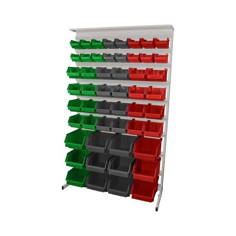 Einseitiges Regal für Werkstattbehälter. Maße: 1560 x 940 x 400 mm, mit einer Ablage für 52 Behälter, grün, grau, rot