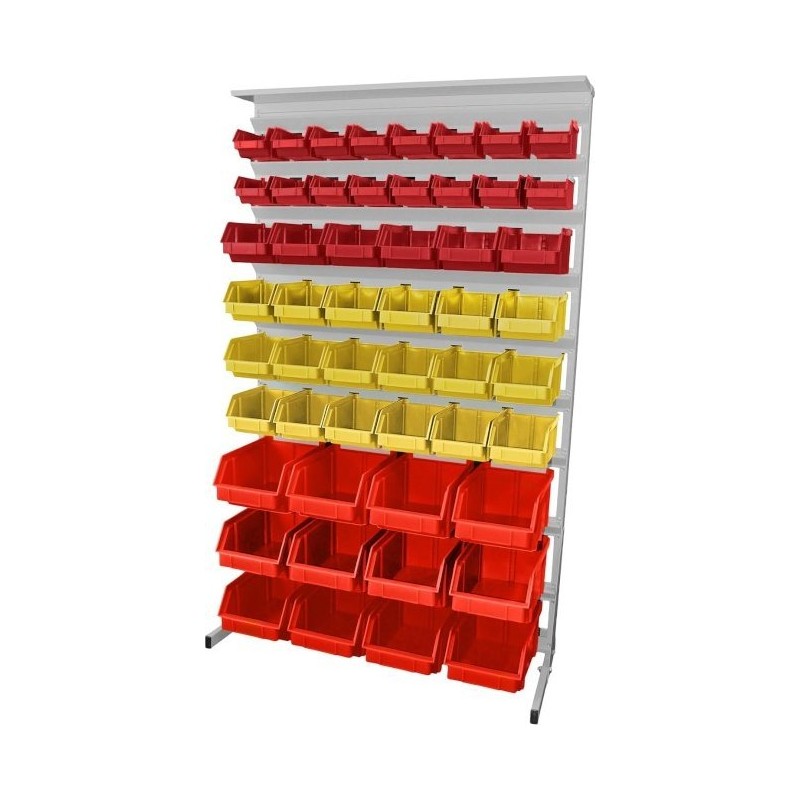 Leomar Regal für Werkstattbehälter, einseitig. Maße: 1560 x 940 x 400 mm, mit Ablage für 52 Behälter, rot, gelb