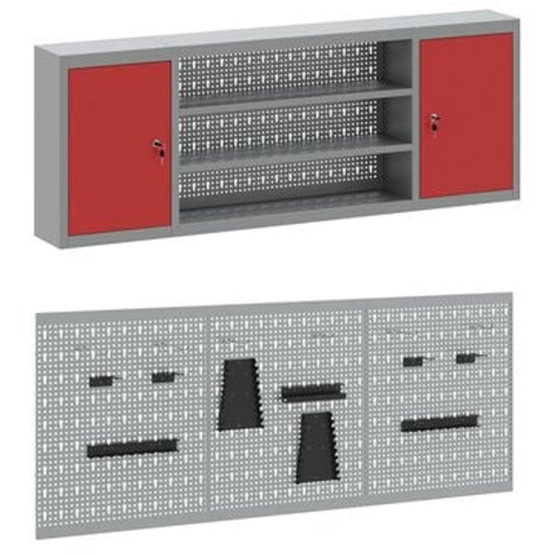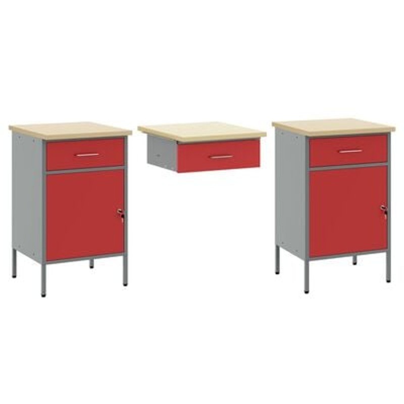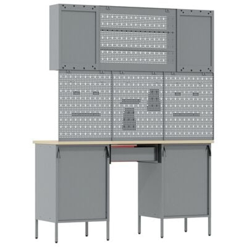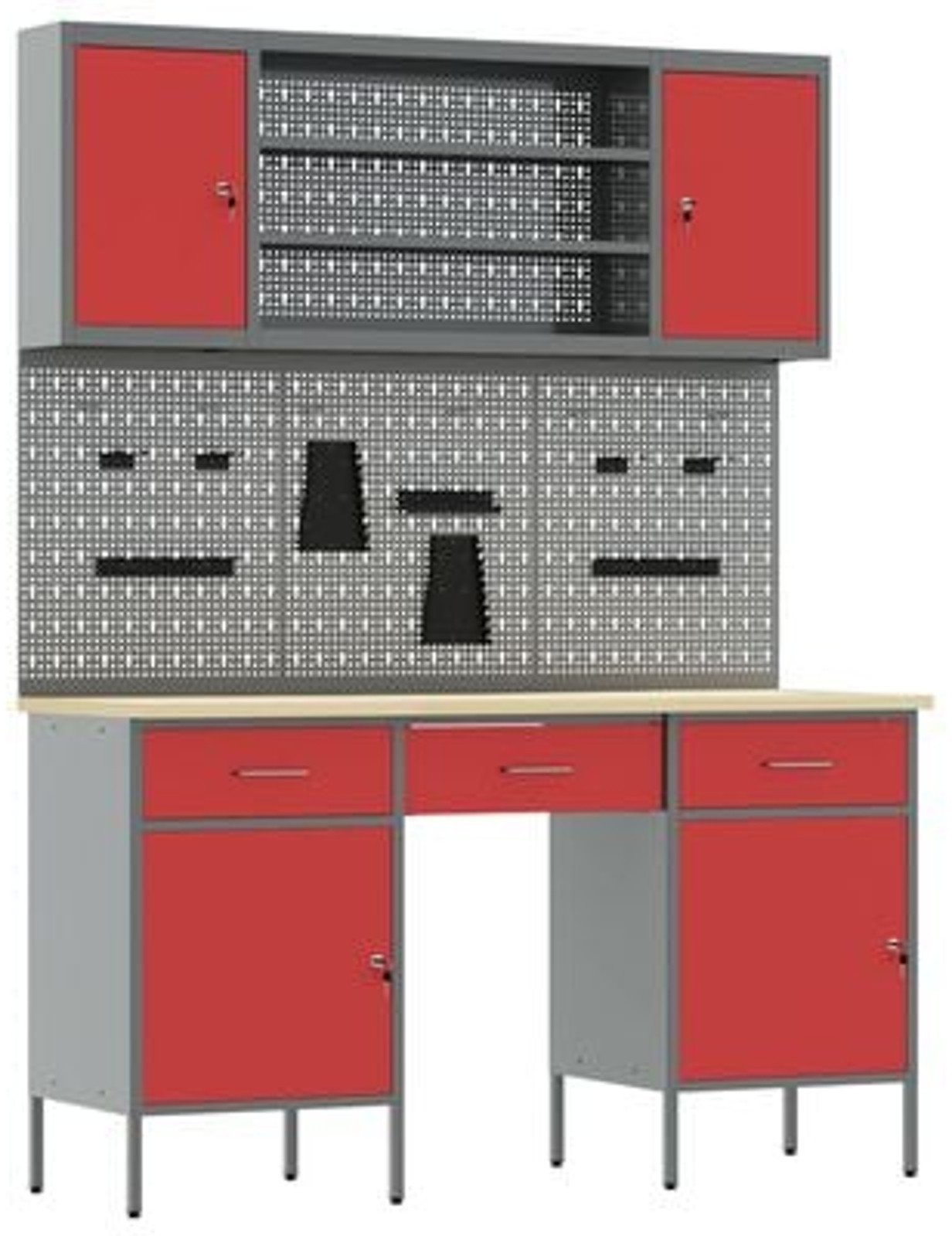 - Lieferumfang: 2 x Arbeitsschrank (mit 1 Tür und 1 Schublade), 1 x Arbeitsschrank (mit 1 Schublade), 3 x Werkzeugwandpaneel, 1 x Werkzeugschrank