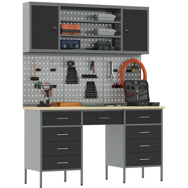 Das vidaXL-Arbeitsset ist ein hervorragendes Angebot für alle, die ihren Arbeitsbereich sowohl funktional als auch ästhetisch organisieren möchten. Das Set besteht aus 7 Elementen, darunter ein Arbeitsschrank und eine Lochwand, und eignet sich perfekt für Werkstätten, Garagen und Kreativstudios. Sein modernes, industrielles Design mit eleganter schwarzer Oberfläche fügt sich hervorragend in vielfältige Einrichtungsstile ein.