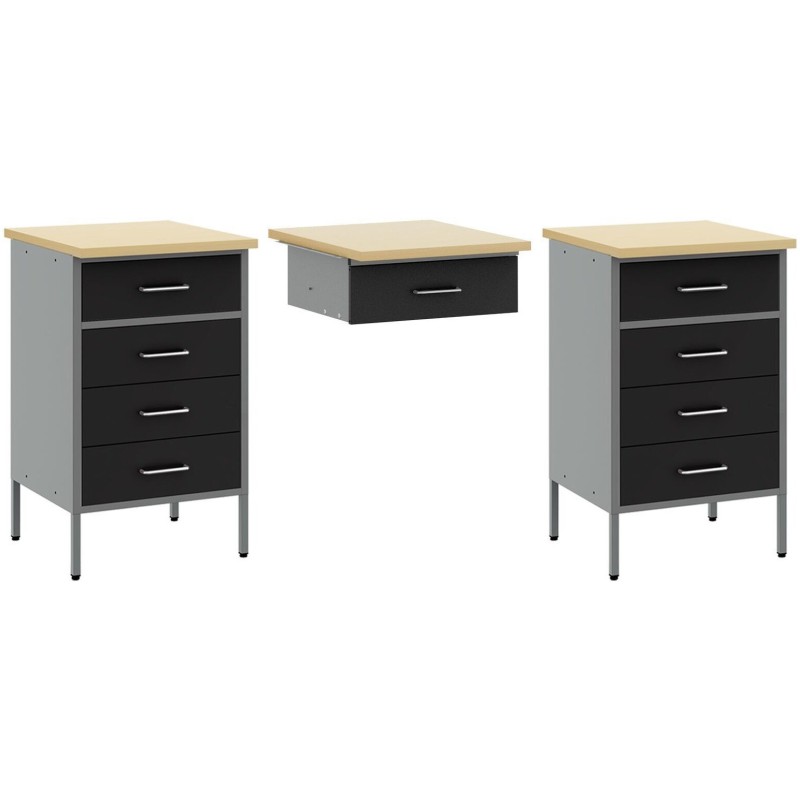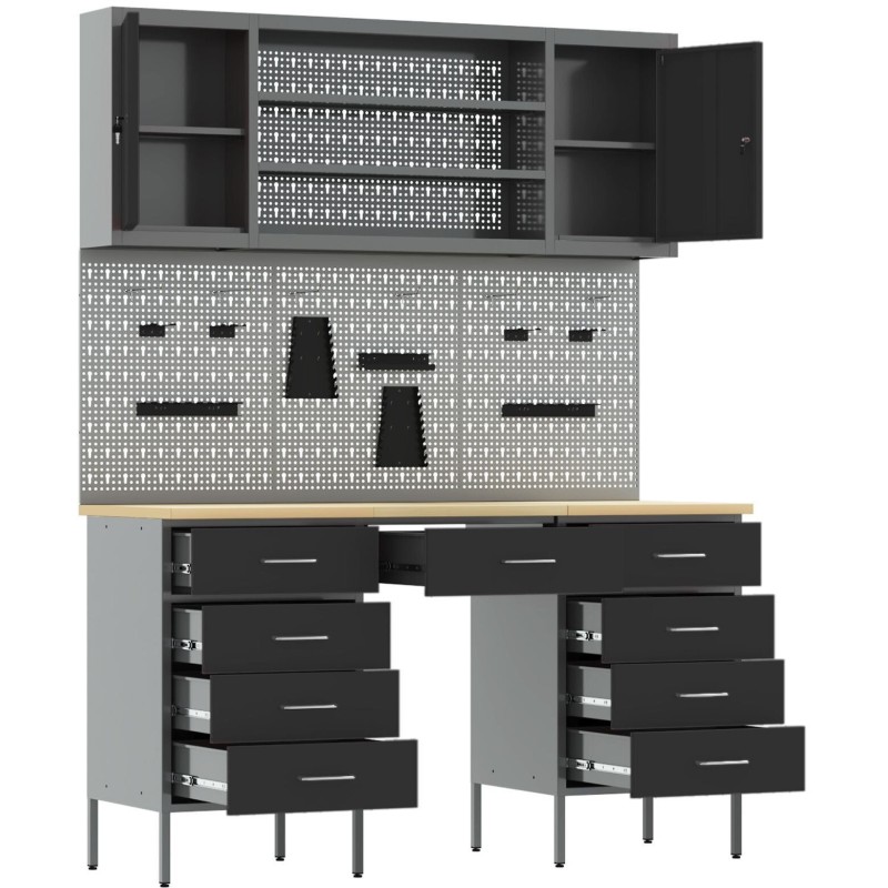Der im Set enthaltene Arbeitsschrank bietet bis zu 12 Fächer, was reichlich Stauraum für Werkzeuge, Zubehör und Ausrüstung gewährleistet. Dadurch wird es wesentlich einfacher, am Arbeitsplatz Ordnung zu halten. Jede Schublade hat eine Tragkraft von bis zu 10 kg, und die Gesamtbelastbarkeit des Sets beträgt 150 kg, was es ideal für die Aufbewahrung vielfältiger Gegenstände macht.