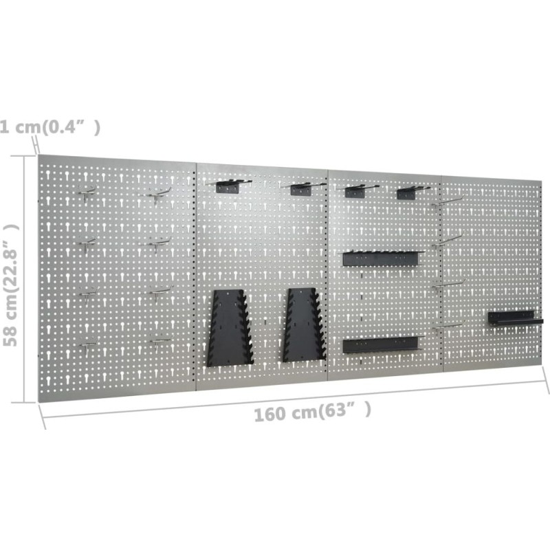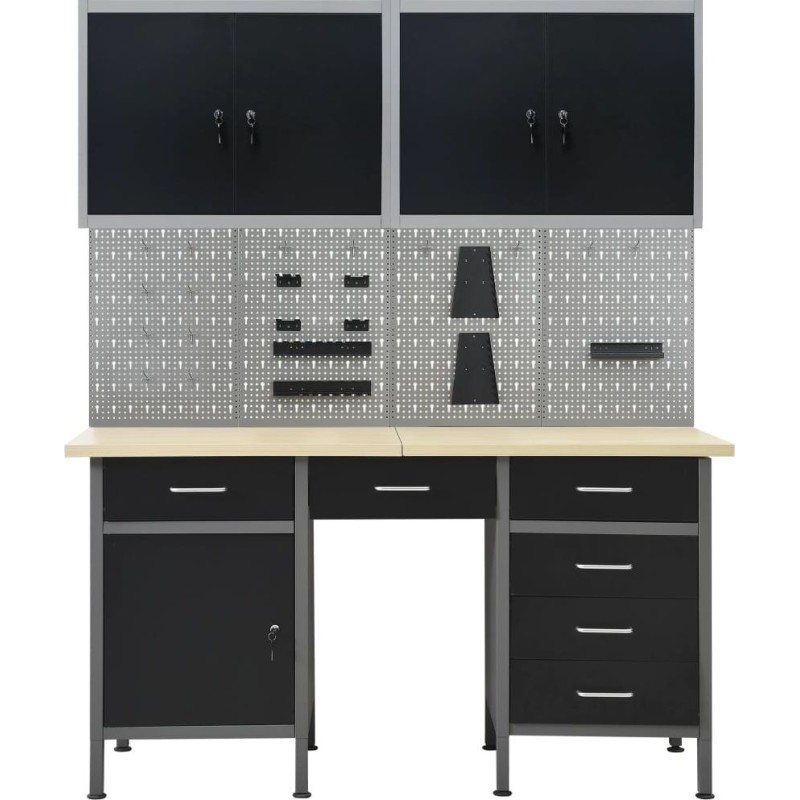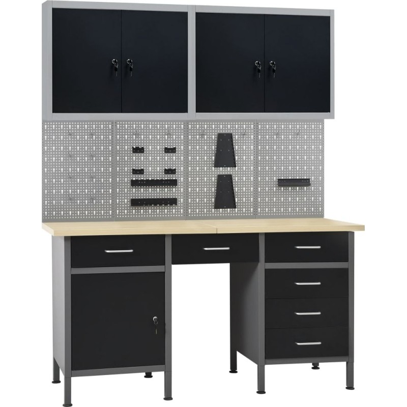 Dieses Set besteht aus 1 Arbeitstisch, 4 Wandpaneelen und 2 Wandschränken und bietet eine praktische Aufbewahrungslösung für die Werkstatt oder Garage. Der robuste Arbeitstisch zeichnet sich durch viel Stauraum und eine Tragkraft von 500 kg aus. Die große und stabile Arbeitsplatte bietet eine solide Arbeitsfläche für alle Reparaturarbeiten. Der Werkbanktisch verfügt über 6 Schubladen, um Werkzeuge, Teile und Zubehör wie Schrauben, Nägel und Klebeband ordentlich zu verstauen. Alle Schubladen sind mit kugelgelagerten Führungen ausgestattet, um ein leichtgängiges Ausziehen zu gewährleisten. Das Möbelstück verfügt über 2 Ablagefächer und einen großen Stauraum mit verschließbaren Türen, in dem Bohrmaschinen, Kabeltrommeln und Schleifmaschinen problemlos Platz finden. Zudem sind die Füße höhenverstellbar. Diese Werkbank ist aus bestem Stahl und Spanplatten gefertigt, wodurch sie besonders robust, langlebig und leicht zu reinigen ist. Das Set ist einfach zu montieren. Diese Werkzeugpaneele aus massivem Stahl können das Gewicht verschiedener Werkzeuge wie Bohrmaschinen, Zangen, Schraubendreher und Schraubenschlüssel tragen. Die Platten sind perforiert, damit Werkzeuge einfach und sicher aufgehängt werden können. Die 4 Paneele lassen sich miteinander verbinden, um ihre Stabilität zu erhöhen. Mit einer Breite von 160 cm ist dies die ideale Lösung für Ihren Arbeitstisch und Ihren Werkstattschrank. Das Möbelstück verfügt über zwei verstellbare Einlegeböden und eine perforierte Platte mit Löchern, an der verschiedene Werkzeuge wie Schraubenschlüssel, Zangen, Hämmer usw. aufgehängt werden können. Ausgestattet mit zwei abschließbaren Türen (jeweils 2 Schlüssel sind im Lieferumfang enthalten) sorgt der Schrank für mehr Sicherheit. Die Metallkonstruktion mit einer besonders robusten, kratzfesten Beschichtung macht das Möbelstück strapazierfähig und leicht zu reinigen. Das Produkt muss zusammengebaut werden.Werkbank:Farbe: schwarz, grauMaterial: Stahl, Spanplatte, MetalllegierungMaße: 160 x 60 x 85 cm (L x B x H)Plattenstärke: 3 cmMaximale Belastung: 500 kgMaximale Belastung einer einzelnen Schublade: 10–15 kg Mit 6 Schubladen auf Kugellagerschienen Mit Schrank mit abschließbaren Türen Tischplatte mit holzähnlicher Maserung Höhenverstellbare Füße Montage erforderlich: ja WARNUNG: Um ein Umkippen des Produkts zu verhindern, müssen die mitgelieferten Befestigungselemente zur Wandmontage verwendet werden.Wandpaneel:Farbe: grau Material: StahlAbmessungen (jeweils): 40 x 58 x 1 cm (L x B x H)Metallstärke: 0,5 mmDurchmesser der kleinen Öffnung: 5,5 mmAbmessungen der länglichen Öffnung: 9,4 x 22,5 mm (B x H)Verschiedene ÖffnungenHängeschrank:Farbe: grau-schwarzMaterial: Metall Abmessungen (jeweils): 80 x 19 x 60 cm (B x T x H) Mit 2 verstellbaren Einlegeböden mit Aufhängern und 1 Lochblech Mit 2 abschließbaren Türen (zu jeder Tür gehören 2 Schlüssel) Montage erforderlich: ja Lieferumfang: 1 x Werkbank 4 x Wandpaneel 21 x Montagezubehör 2 x Hängeschrank...