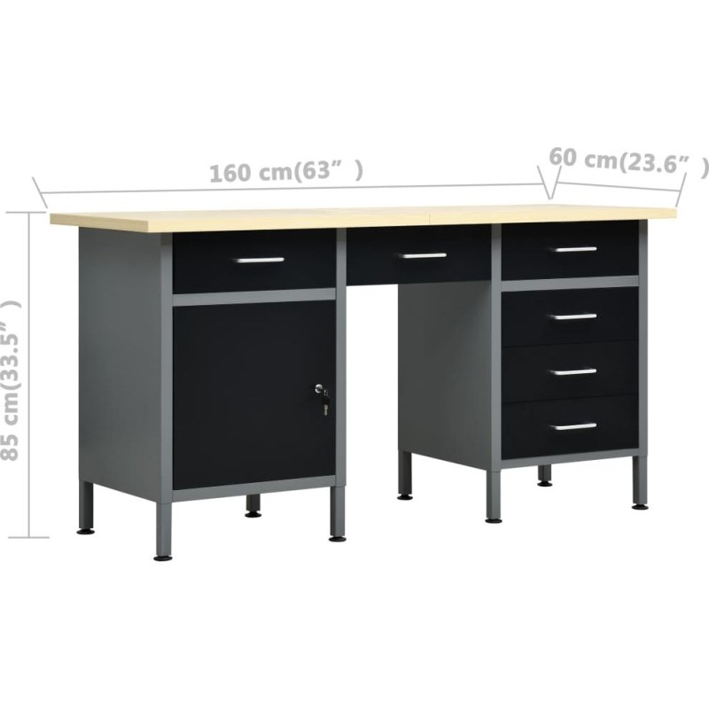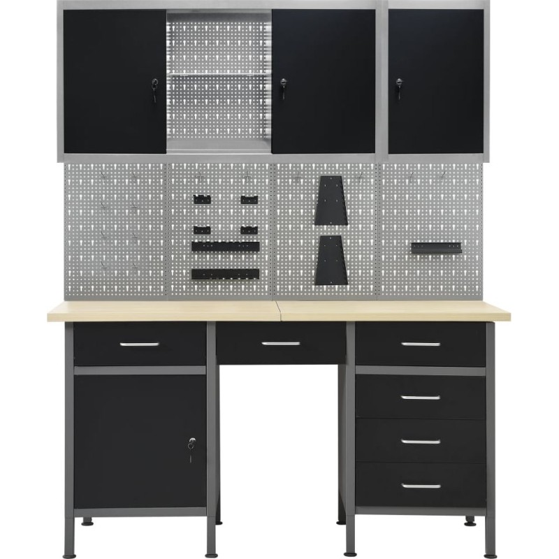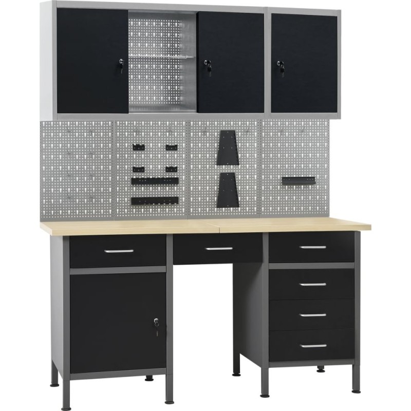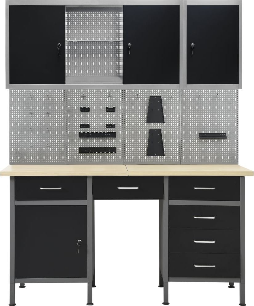 Dieses Set besteht aus 1 Arbeitstisch, 4 Wandpaneelen und 2 Wandschränken und bietet eine praktische Aufbewahrungslösung für die Werkstatt oder Garage. Der robuste Arbeitstisch zeichnet sich durch viel Stauraum und eine Tragkraft von 500 kg aus. Die große und stabile Arbeitsplatte bietet eine solide Arbeitsfläche für alle Reparaturarbeiten. Der Werkbanktisch verfügt über 6 Schubladen, um Werkzeuge, Teile und Zubehör wie Schrauben, Nägel und Klebeband ordentlich zu verstauen. Alle Schubladen sind mit kugelgelagerten Führungen ausgestattet, um ein leichtgängiges Ausziehen zu gewährleisten. Das Möbelstück verfügt über 2 Ablagen und einen großen Stauraum mit verschließbaren Türen, in dem Bohrmaschinen, Kabeltrommeln und Schleifmaschinen bequem Platz finden. Zudem sind die Füße höhenverstellbar. Diese Werkbank ist aus bestem Stahl und Spanplatten gefertigt, wodurch sie besonders robust, langlebig und leicht zu reinigen ist. Das Set ist einfach zu montieren. Die Werkzeugpaneele bestehen aus massivem Stahl, um das Gewicht verschiedener Werkzeuge wie Bohrer, Zangen, Schraubendreher und Schraubenschlüssel zu tragen. Die Platten sind perforiert, um Werkzeuge einfach und sicher aufzuhängen. Die 4 Paneele lassen sich miteinander verbinden, um ihre Stabilität zu erhöhen. Mit einer Breite von 160 cm ist dies die ideale Lösung für Ihren Arbeitstisch und Ihren Schrank in der Werkstatt. Dieses Set verfügt über zwei Schränke zur Aufbewahrung von Werkzeugen. Der große Schrank verfügt über drei verstellbare Einlegeböden und eine Lochplatte. Der kleinere Schrank hat einen verstellbaren Einlegeboden und eine Lochplatte zum Aufhängen verschiedener Werkzeuge wie Schraubenschlüssel, Zangen, Hämmer usw. Der Werkzeugschrank ist mit einer abschließbaren Tür (2 Schlüssel im Lieferumfang enthalten) ausgestattet, um für mehr Sicherheit zu sorgen. Er besteht aus Metall mit einer besonders robusten, kratzfesten Beschichtung, wodurch er langlebig und leicht zu reinigen ist. Dieses Produkt muss zusammengebaut werden.Werkbank:Farbe: schwarz, grauMaterial: Stahl, Spanplatte, MetalllegierungMaße: 160 x 60 x 85 cm (L x B x H)Plattenstärke: 3 cmMaximale Belastung: 500 kgMaximale Belastung einer einzelnen Schublade: 10–15 kg Mit 6 Schubladen auf Kugellagerschienen Mit Schrank mit abschließbaren Türen Tischplatte mit holzähnlicher Maserung Höhenverstellbare Füße Montage erforderlich: ja WARNUNG: Um ein Umkippen des Produkts zu verhindern, müssen die mitgelieferten Befestigungselemente zur Wandmontage verwendet werden.Wandpaneel:Farbe: grauMaterial: StahlAbmessungen (Einzelstück): 40 x 58 x 1 cm (L x B x H)Metallstärke: 0,5 mmDurchmesser der kleinen Öffnung: 5,5 mmAbmessungen der länglichen Öffnung: 9,4 x 22,5 mm (B x H)Verschiedene ÖffnungenHängeschrank (Breite 120 cm):Farbe: grau-schwarzMaterial: Metall Abmessungen: 120 x 19 x 60 cm (B x T x H)Mit 3 verstellbaren Einlegeböden mit Haken und 1 LochblechMit 2 abschließbaren Türen (2 Schlüssel im Lieferumfang enthalten)Montage erforderlich: jaHängeschrank (Breite 40 cm):Farbe: grau-schwarzMaterial: Metall Maße: 40 x 19 x 60 cm (B x T x H) Mit 1 verstellbarem Einlegeboden und 1 LochblechMit 1 abschließbarer Tür (2 Schlüssel im Lieferumfang enthalten) Montage erforderlich: jaLieferumfang:1 x Werkbank4 x Wandpaneel21 x Montagezubehör1 x Hängeschrank (Breite 120 cm)1 x Hängeschrank (Breite 40 cm)Weitere Informationen zur Kippschutzvorrichtung für Möbel finden Sie hier https://media.vidaxl.com/media/wysiwyg/documents/prevent_tipping_over/PL.pdf ...